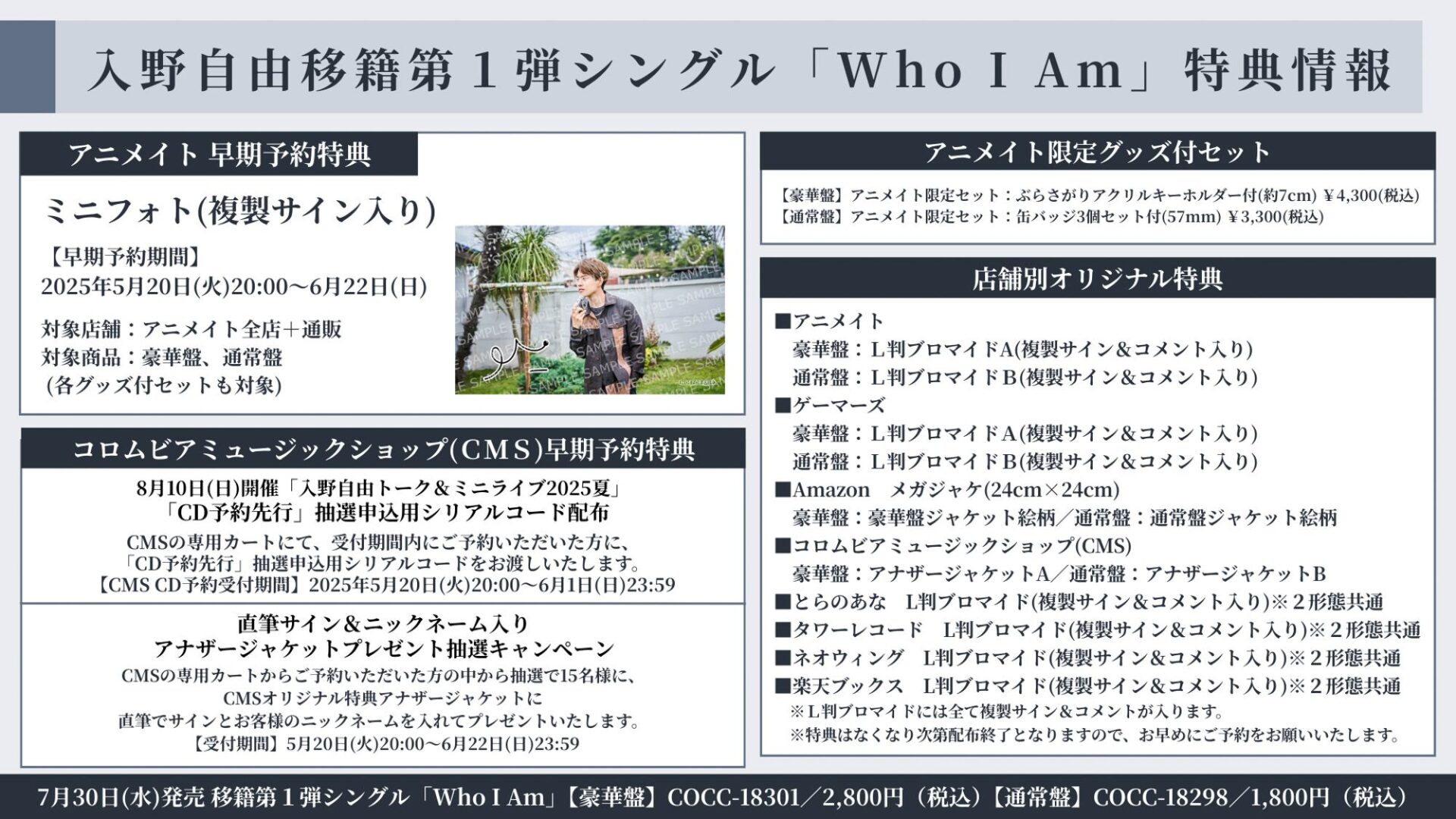 入野自由移籍第1弾シングル「Who I Am」をお買上げの方に、店舗別オリジナル特典をプレゼント!「Who I Am」を各対象店舗にて対象商品を予約・購入した方を対象に先着で配布されます。