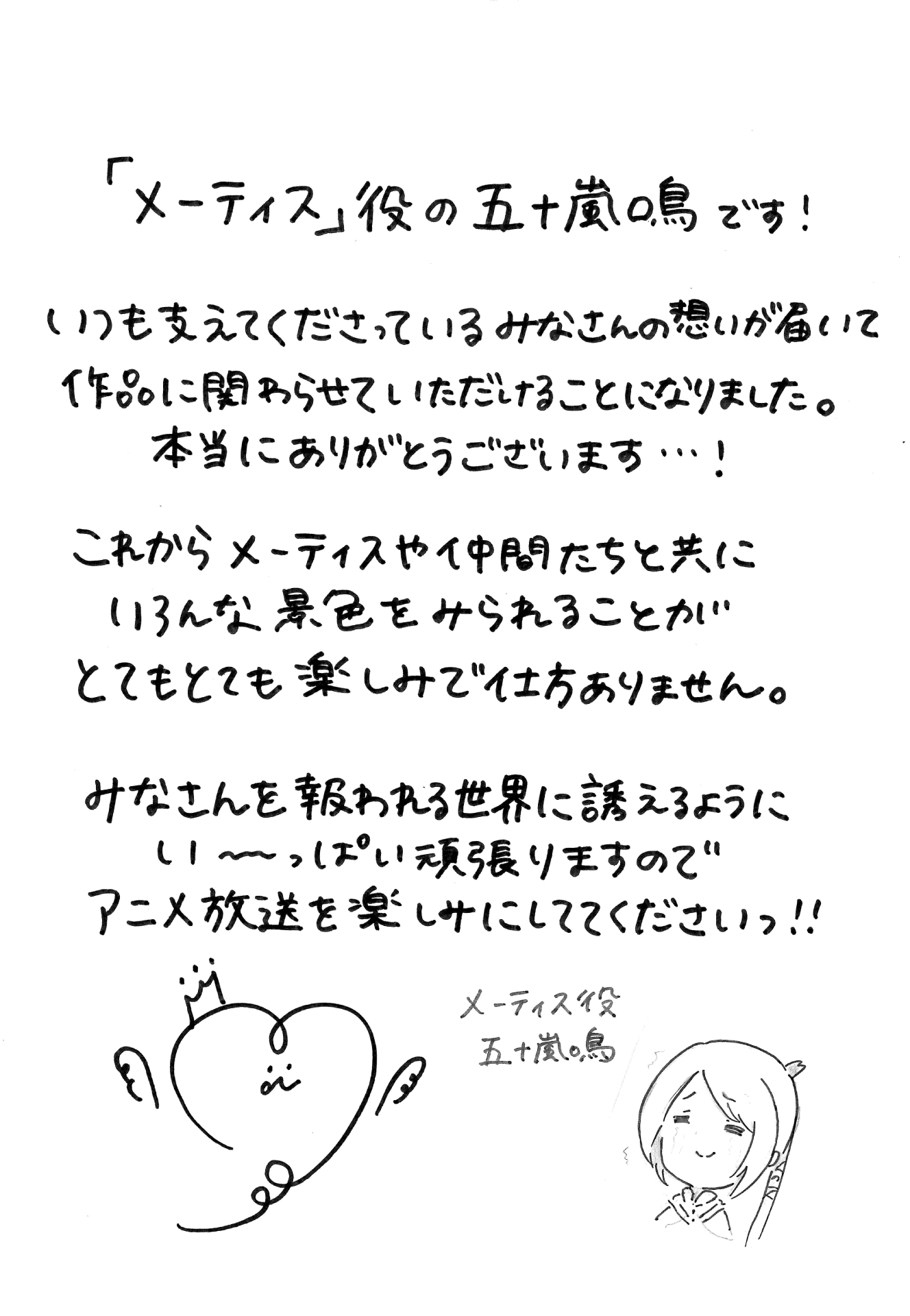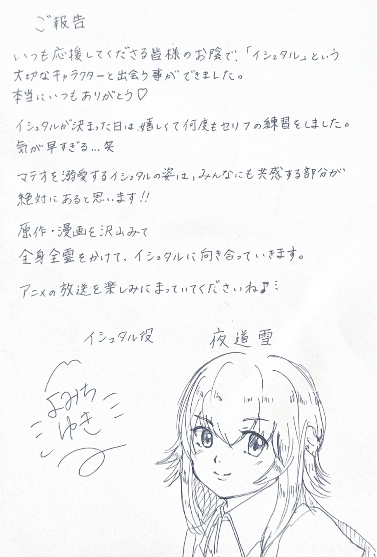 出演が決定した内田真礼さん(マテオ役)、夜道 雪さん(イシュタル役)、東城咲耶子さん(ヘカテー役)、五十嵐 鳴さん(メーティス役)からの直筆コメントもあわせて公開されました。