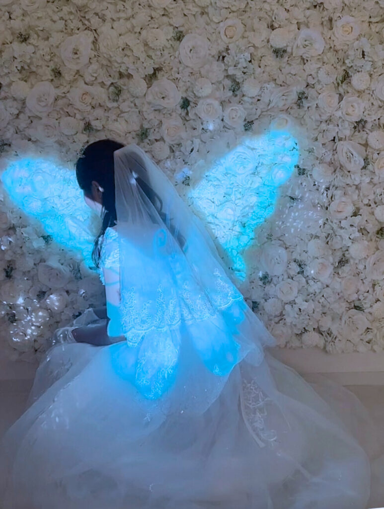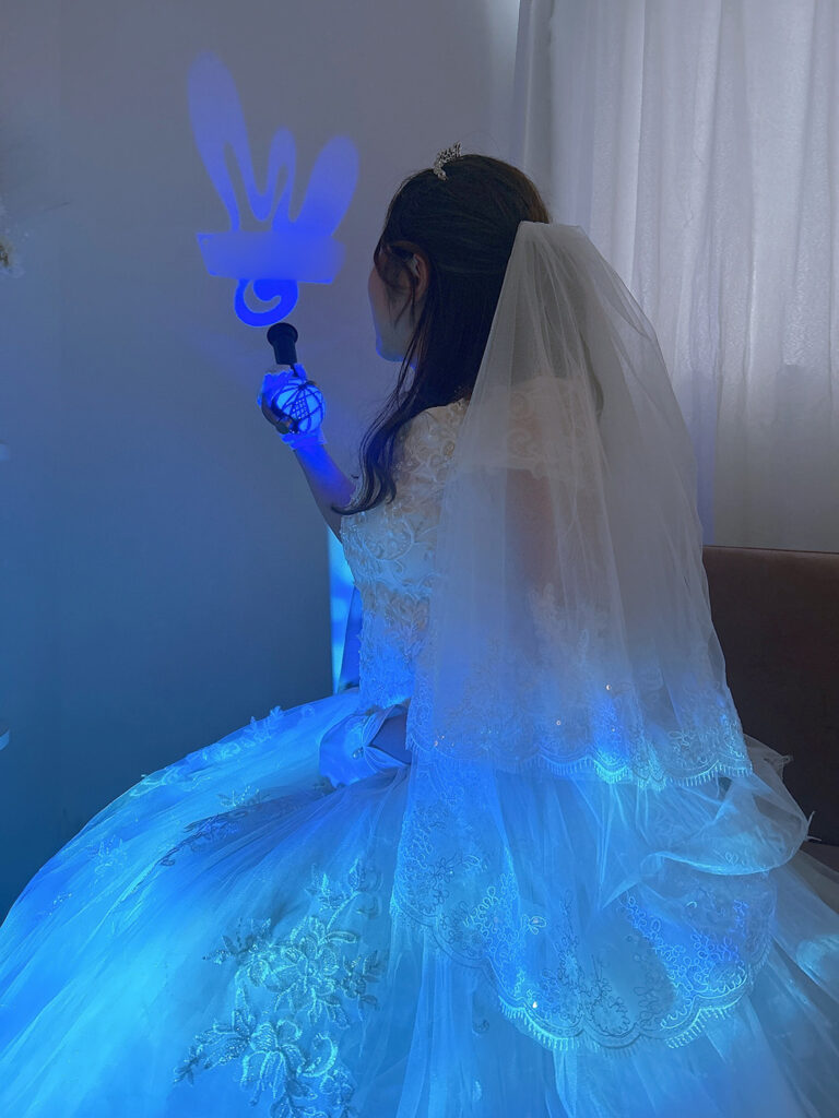 通常の撮影と一緒に、花びらが舞う演出、宇宙空間を思わせる背景、星やハートの動くエフェクトなどをプロジェクターでスタジオに投影。静止画ながら“物語の中にいるような没入体験”が味わえる撮影演出を実現しています。
