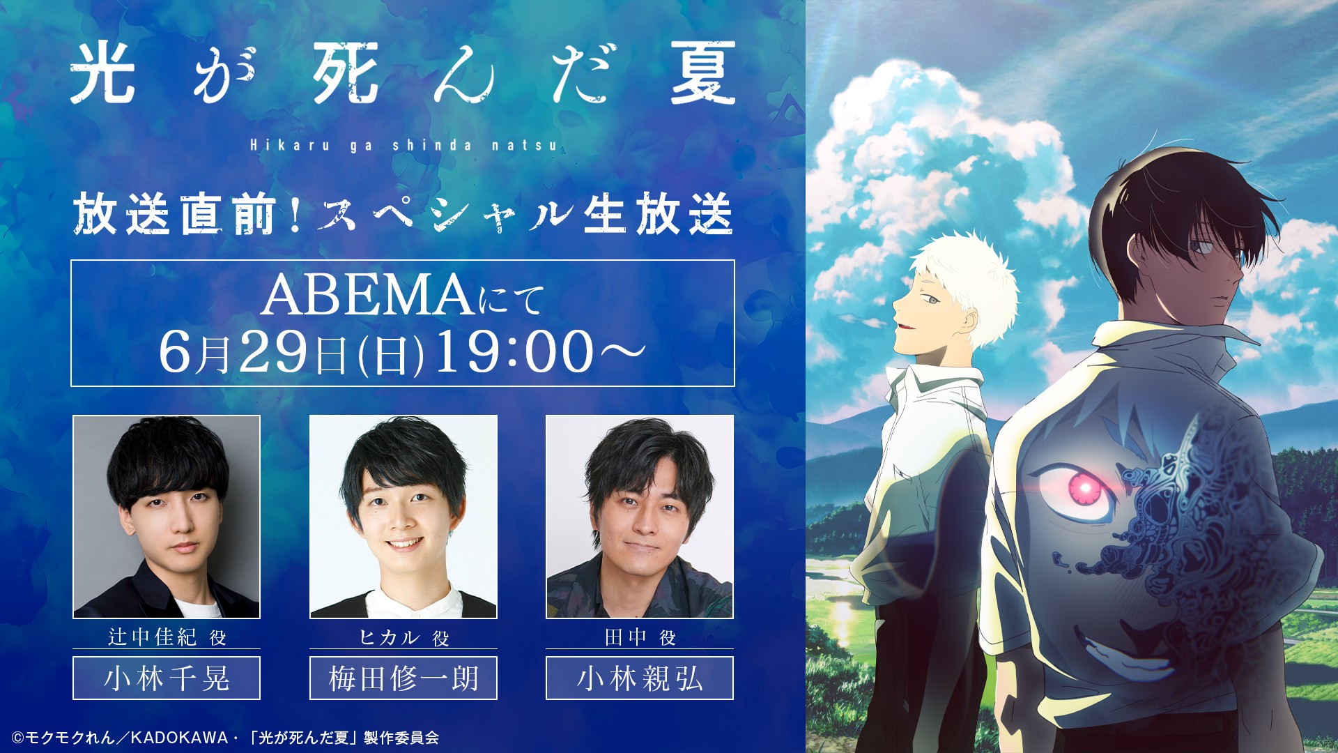 さらに同日、「ABEMA」で生特番「TVアニメ『光が死んだ夏』放送直前!スペシャル生放送」の独占無料生放送が決定。メインキャスト3名が出演して、見どころを徹底解説してくれるようなので、プレミアム上映イベントとあわせてぜひチェックしましょう!