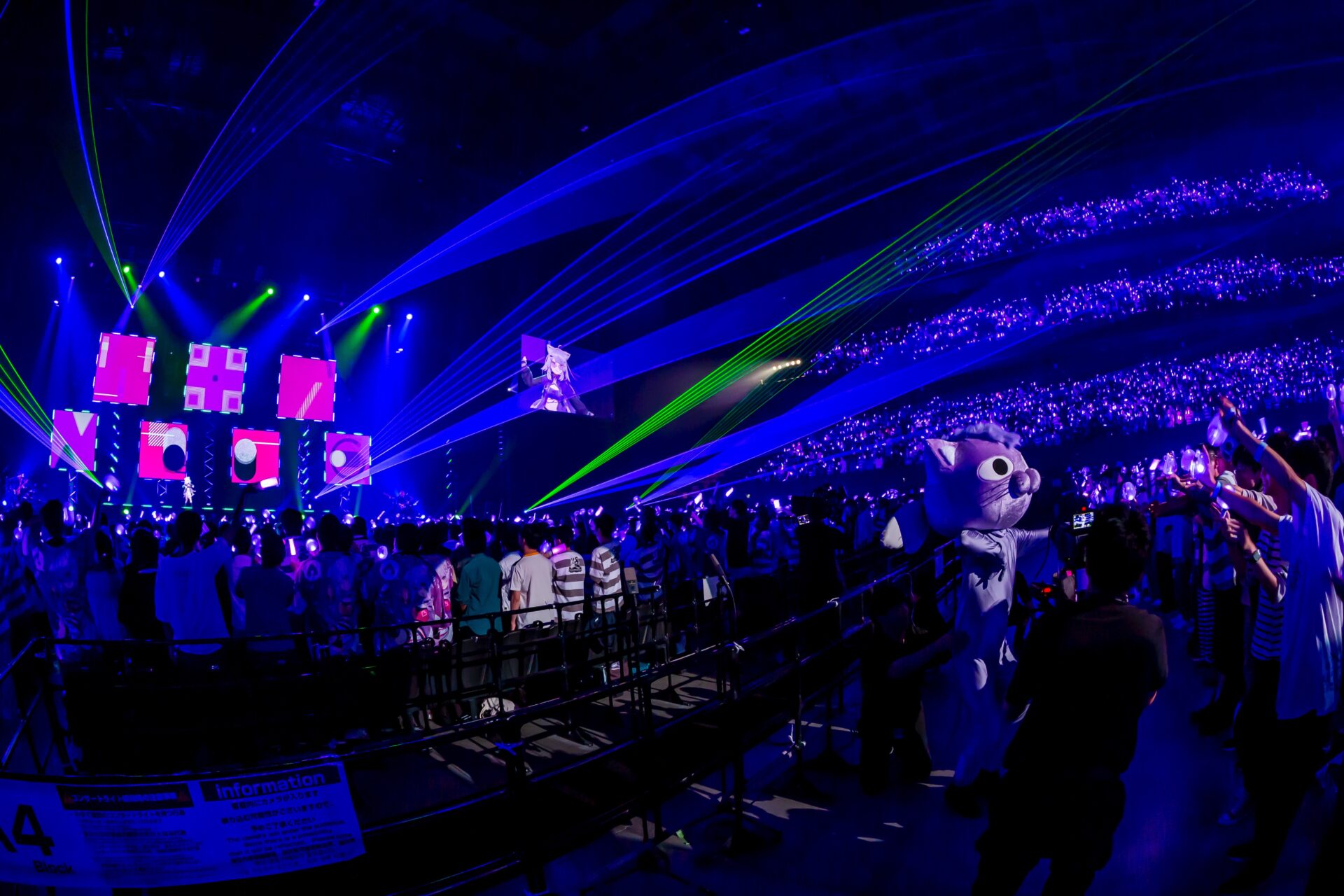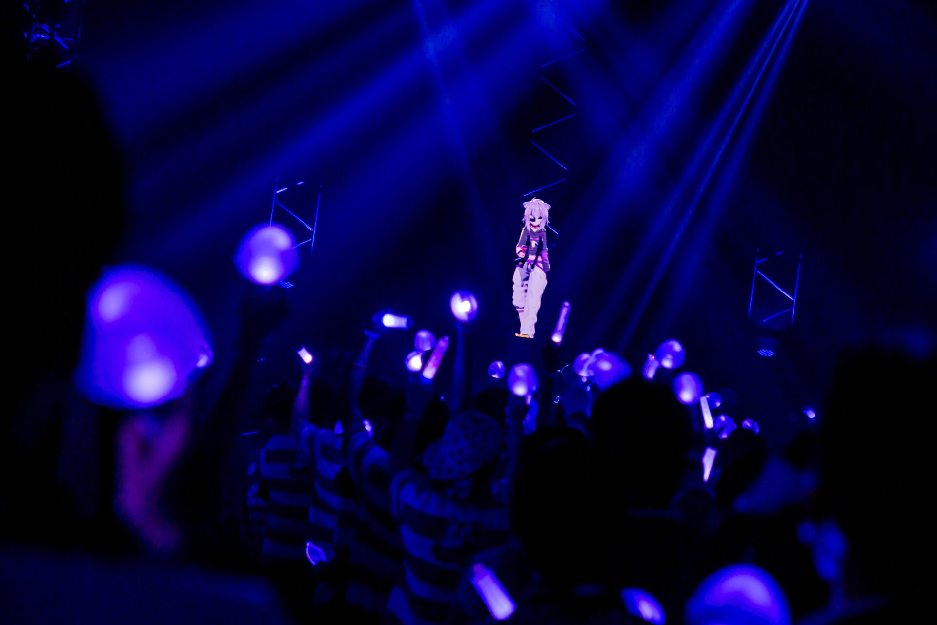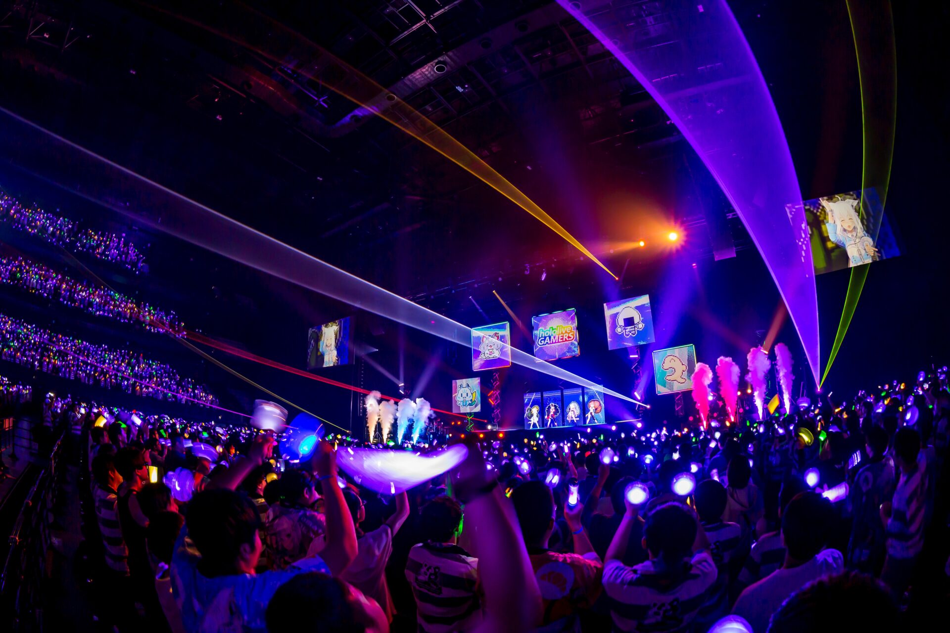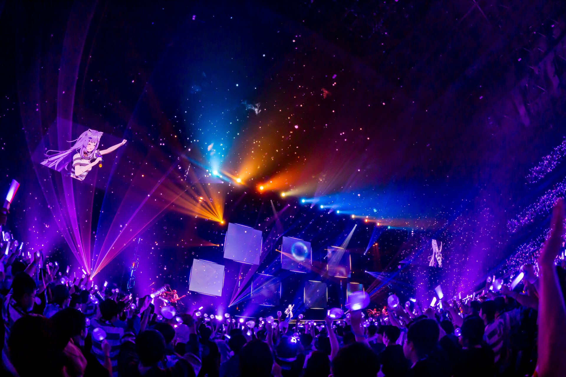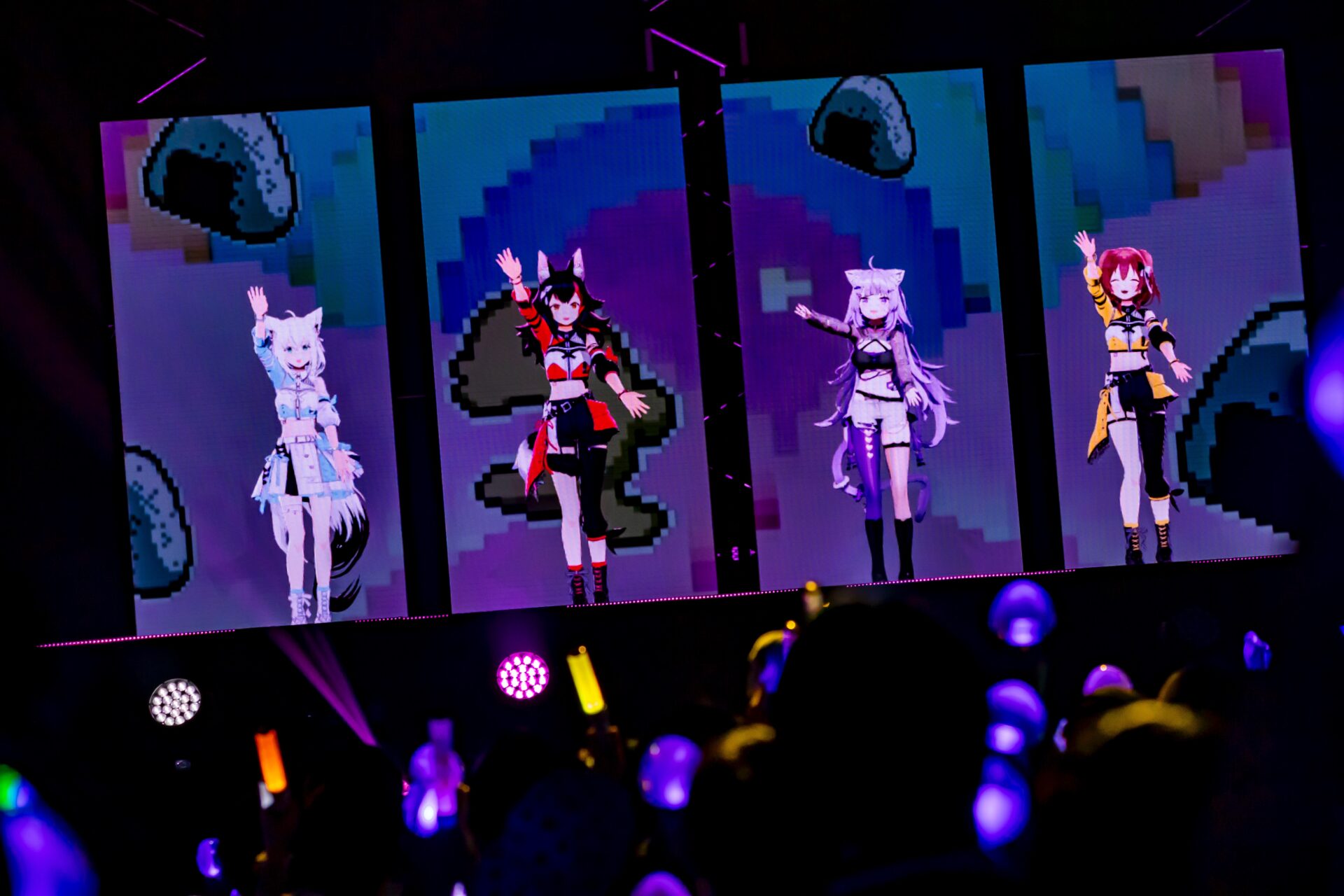 楽曲の最後を白上フブキが「こうしてぴあアリーナに平和が訪れたのであった―――」とこの日だけの歌詞で締めくくると、MCでは4人ならではの漫才のようなやりとりで会場が爆笑。続いて、猫又おかゆの代表曲のひとつ「もぐもぐ YUMMY!」を4人でパフォーマンスし、サビでは観客も含めた全員で「もぐもぐ!」「もぐもぐ!」と盛り上がった。