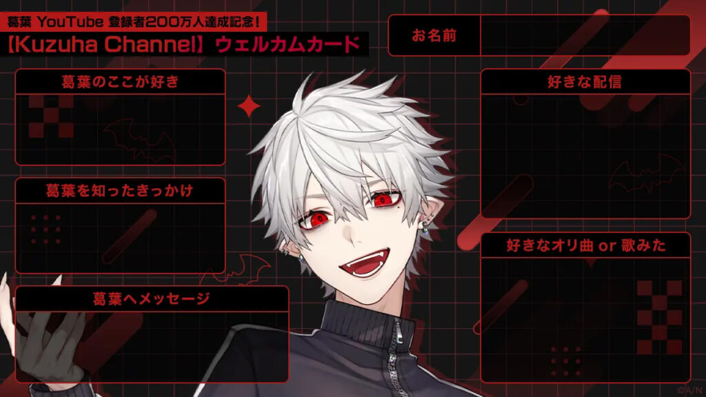 SNS上で、誰でも使用できる葛葉さん仕様のウェルカムカードが現在配信中です。ハッシュタグ「#KuzuhaChannelウェルカムカード」をつけて、投稿しましょう!