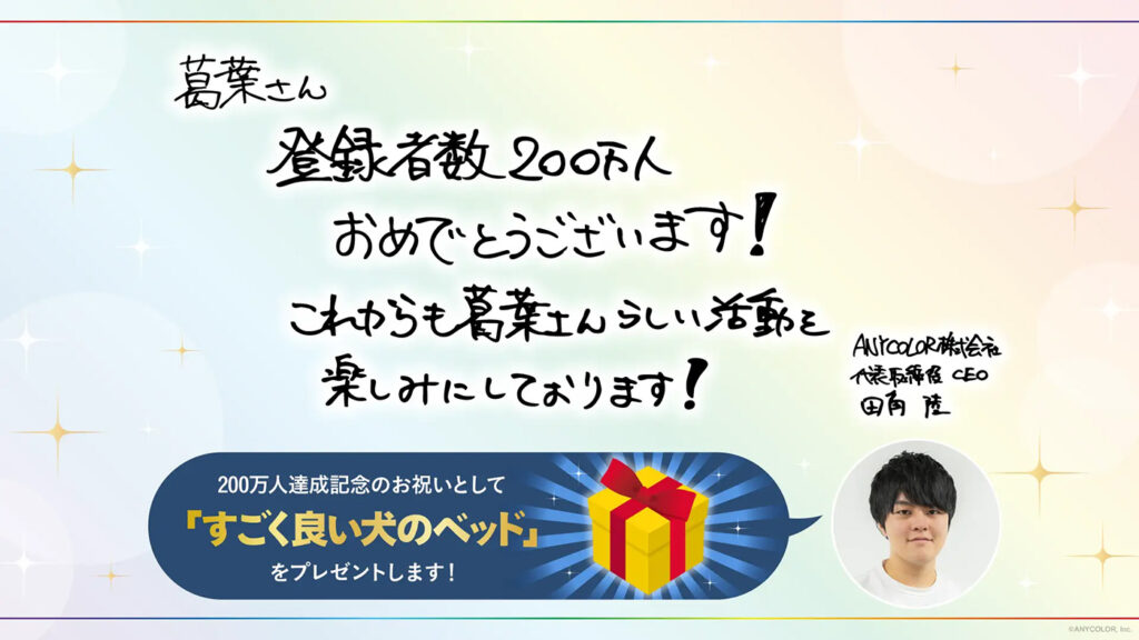 また、今回の快挙を記念し、同社代表取締役 CEOの田角陸さんから葛葉さんへ、プレゼントの贈呈が行われることが明らかに。葛葉さんへの贈呈品は「すごく良い犬のベッド」とのこと。田角さんから葛葉さんへのメッセージもご紹介します。