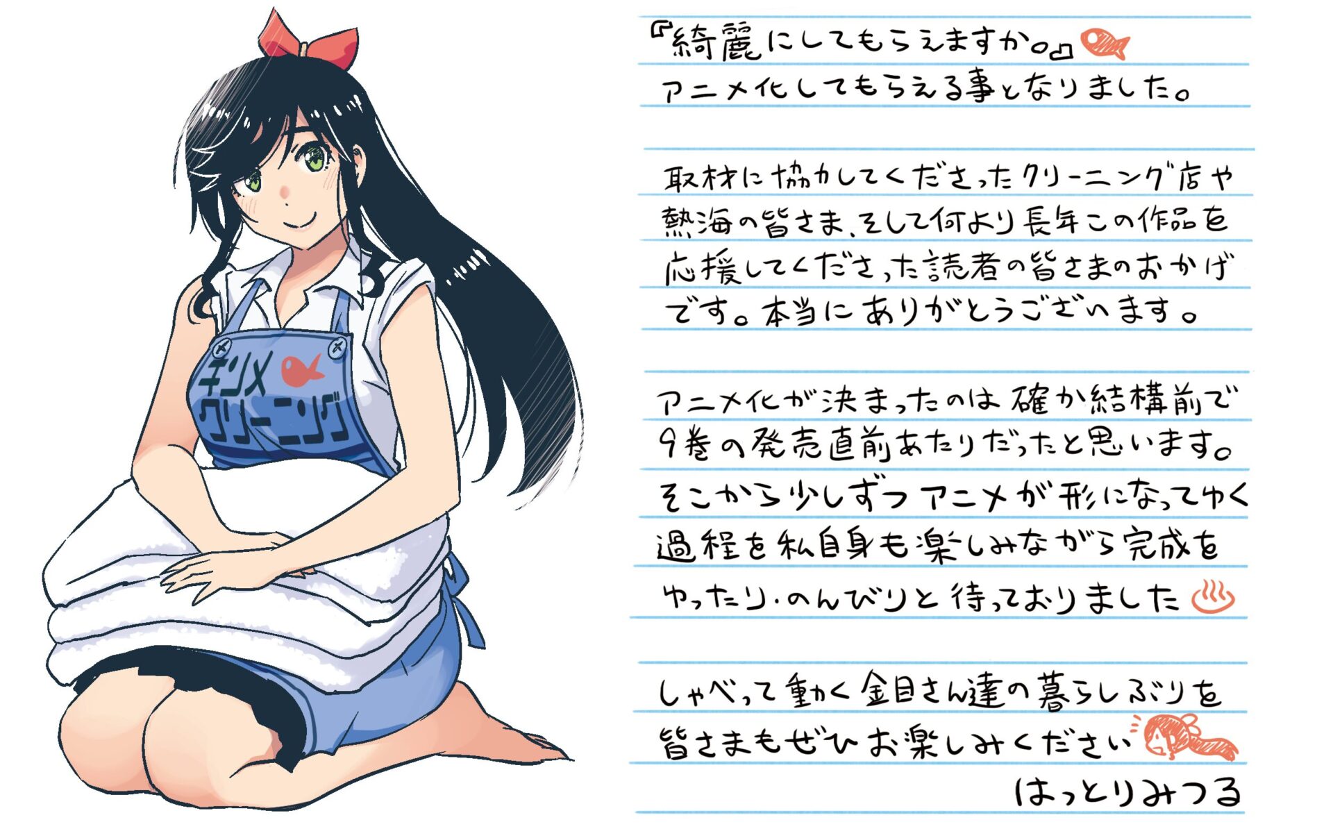 2026年にアニメ化が決定した『綺麗にしてもらえますか。』。同作は、熱海で小さなクリーニング店を営む金目綿花奈(きんめわかな)と、彼女を巡る人々が織りなす、ひきこもごもストーリーです。