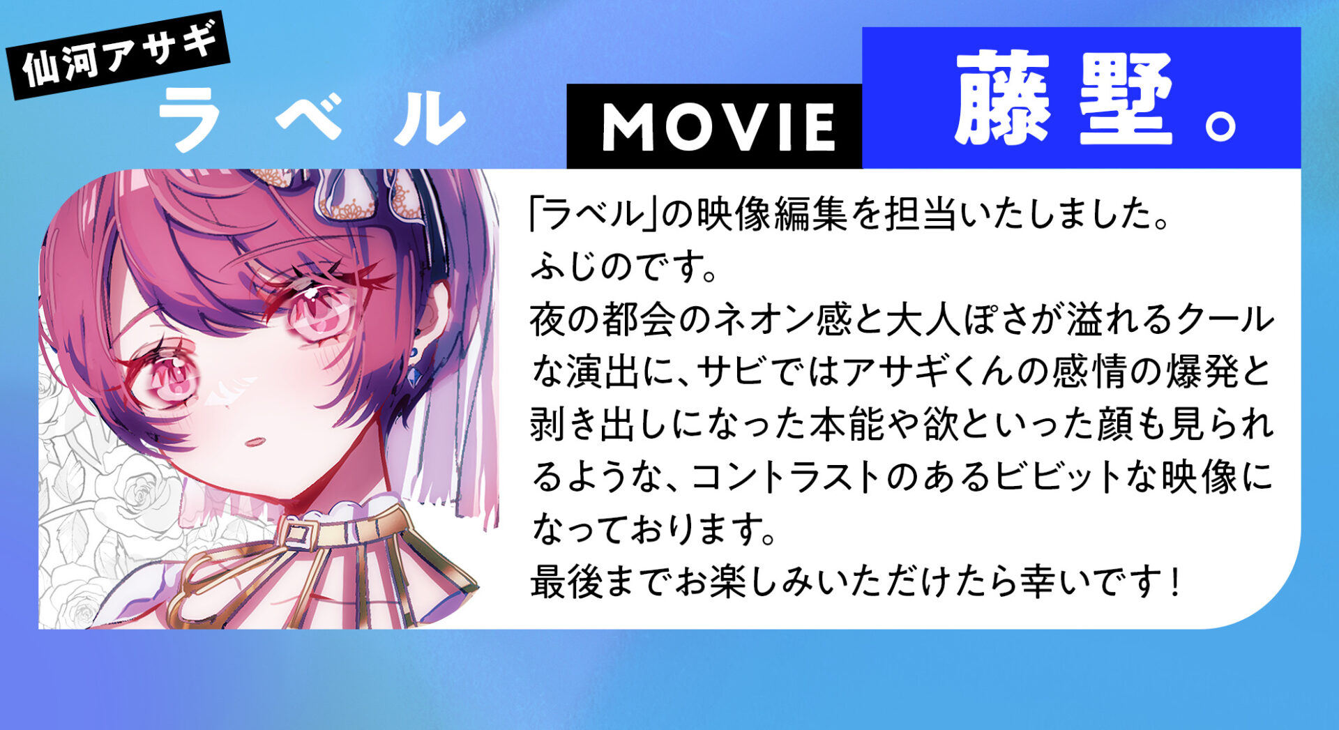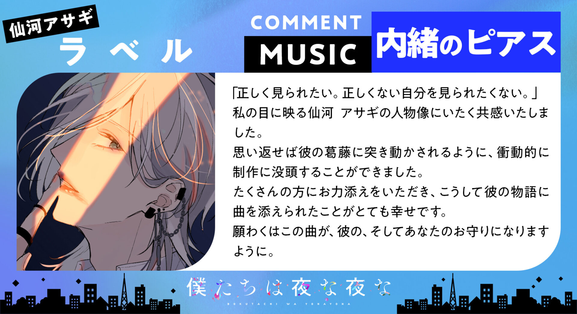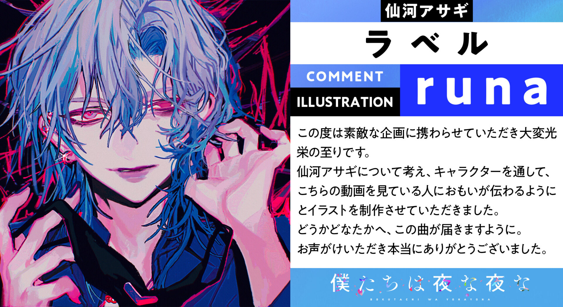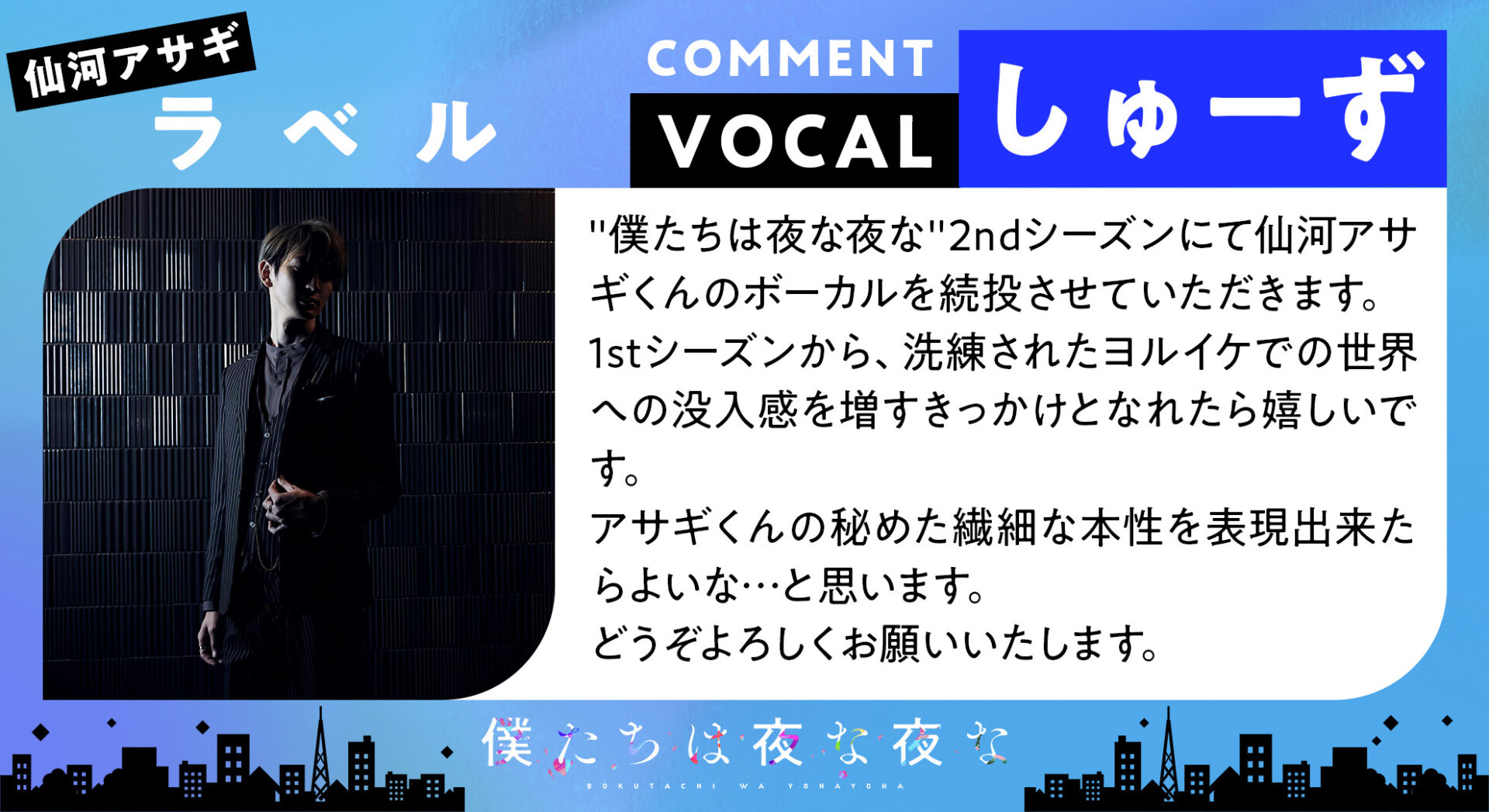 そんな『僕たちは夜な夜な』2ndシーズン第2弾では、仙河アサギが登場。同キャラクターの声を担当する江口拓也さんによるストーリー動画が楽しめます。加えて、歌唱を担当する歌い手・しゅーずさんによる楽曲「ラベル」のMVが公開に!