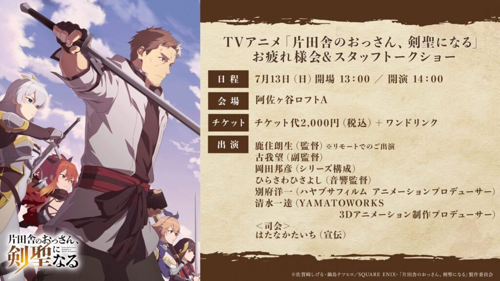 TVアニメ『片田舎のおっさん、剣聖になる』の最終回放送終了後となる7月13日(日)に、本作のスタッフ陣が出演する打ち上げ形式のトークショーが、阿佐ヶ谷ロフトで行われることが決定! 現在チケットが販売中です。