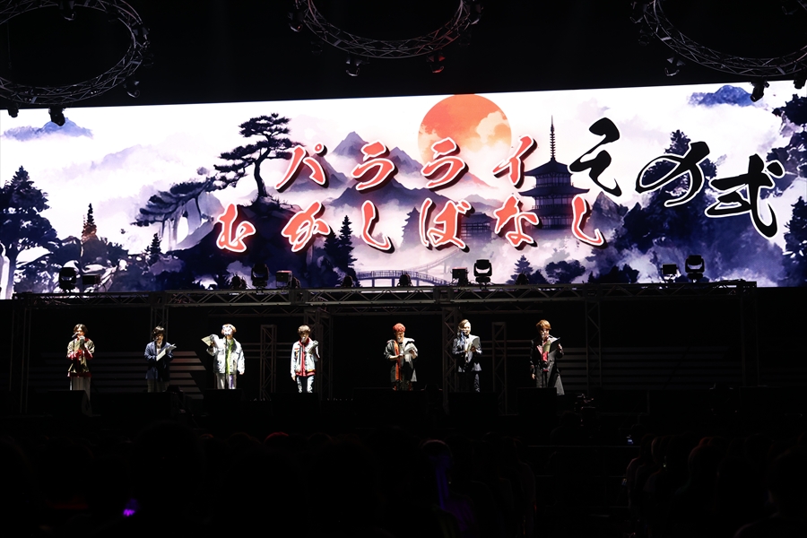 会場が暗転し映像が流れると「パラライむかしばなし 浦島太郎編」と題した朗読劇がスタート。浦島那由汰が、助けたウミガメの葵と甘太郎に導かれ、海の底にある“Club竜宮城”を訪れます。そこで善、神林、紫音の海のラッパーたちから勝負を挑まれた那由汰は・・・という書き下ろしのストーリー。ユーモアあふれる掛け合いに、フロアからは時折笑いがこぼれ、心地よい空気が漂います。再び場が暗転すると、次に始まったのは「パラライむかしばなし 桃太郎編」。生まれて間もないころからマイクを握りラップを始めた桃太郎のアレンが、クラブのイベント荒らしを成敗する旅に出ます。桃太郎の仲間になる犬・猿・雉こと、四季ドッグ・グレートビューティーモンキー斗真・玲央バードを連れて、“Club鬼ヶ島”へ向かうアレン。きびだんご、改め自作のビートを提げて、フロウの鬼・西門とライミングの鬼・忠成とラップバトルを繰り広げます。浦島太郎編に続いて、小粋なユーモアとアドリブが光る昔話が届けられ、盛大な拍手がフロアを満たしました。