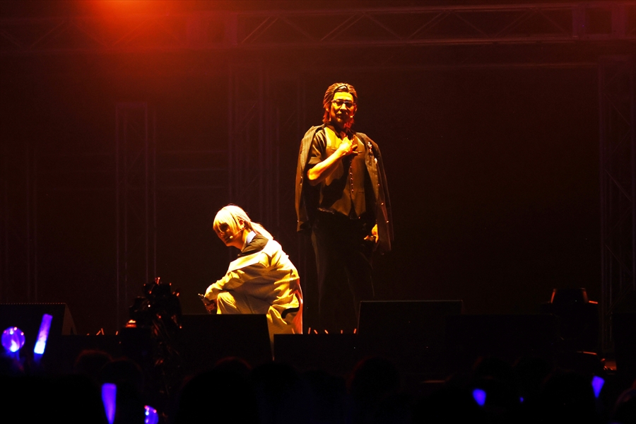 スペーシーなノイズが鳴り響くと、「幻影ライブ in Space」と題したパラステチームによるライブ&ショート劇がスタート。大気圏を突破したアーティストたちが、会場を煽りながら宇宙での特別な幻影ライブへと誘います。トップバッターを飾るのは【BAE】の朱雀野アレン(佐奈宏紀)とアン・フォークナー(立道梨緒奈)。「AmBitious!!!」を披露するとフロアの熱は急上昇し、そのままの勢いで【cozmez】の「Back Off」へ。矢戸乃上 珂波汰(土屋直武)と矢戸乃上 那由汰(大崎捺希)が双子の絆を見せつけます。続く【The Cat’s Whiskers(以下、TCW)】の西門直明(竹内良太)と棗リュウ(堀海登)がドラマチックなライティングで「MASTER OF MUSIC」を歌い上げ、続く【悪漢奴等】の翠石依織(武子直輝)・征木北斎(稲垣成弥)・伊藤紗月(小林竜之)・円山玲央(神越将)が「TURN IT UP!!!!!! -悪漢SOUL FEVER-」でヘッズを大いに盛り上げます。各ユニットの魅力に引き寄せられたのか、ライブステージにUFOが出現。思いがけない宇宙人の来訪にテンション最高潮のまま、舞台オリジナル楽曲の「Here We Go」と「Fight For The PRIDE」を2曲続けて披露し、パラステキャスト10名が放つビッグバン級のボーカルにフロアは歓喜と熱狂に包まれました。