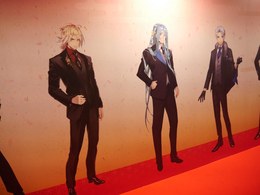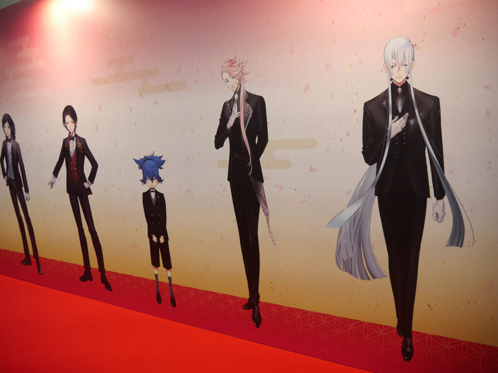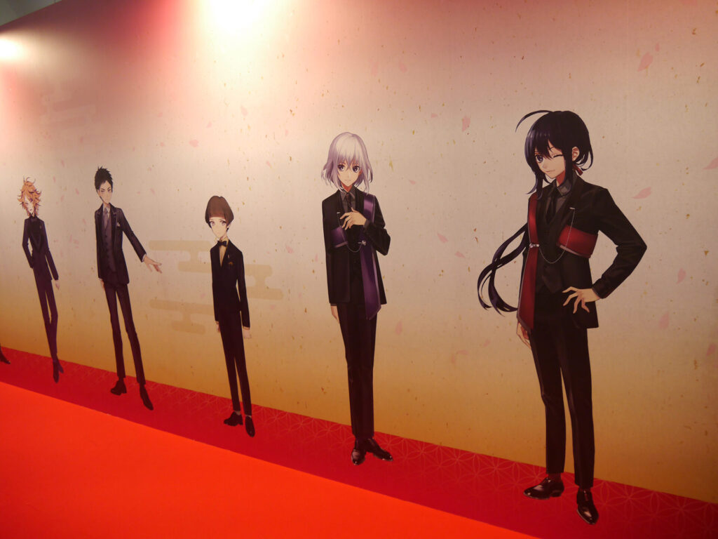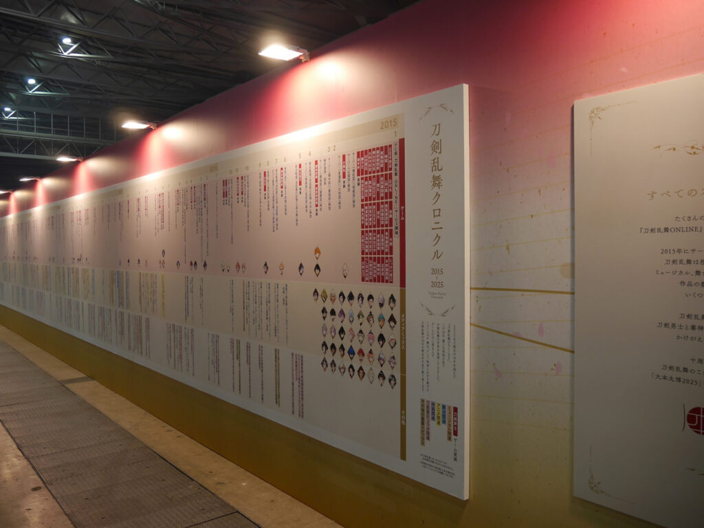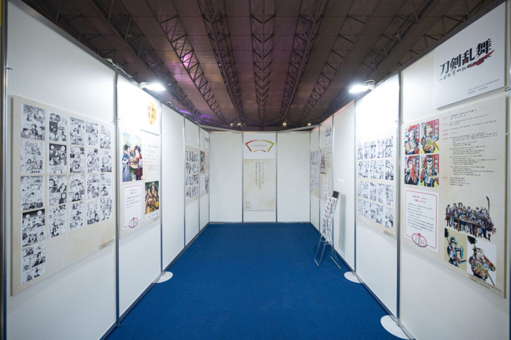 場内はフォトスポット、祝装(十周年記念Ver.)の装いに身を包んだ刀剣男士の壁面展示、『刀剣乱舞』の10年間の軌跡がまとめられた「刀剣乱舞クロニクル」、祝装(十周年記念Ver.)の刀剣男士1振りと記念撮影をすることができる「大本丸博 記念撮影館」、本イベントのオリジナルメニューを食べることができるアニメイトキッチンカー、太刀「復元 三日月宗近 真」を始め、三日月宗近と始まりの五振りにゆかりのある真剣が展示された「刀剣展示」、ミュージカル・舞台・アニメ・映画・コミカライズ・歌舞伎などさまざまなメディアミックスを振り返ることができる「とある本丸ブース」、そしてグッズの展示&販売が行われていた「スポンサーブース」と見どころ満載のエリアがありました。