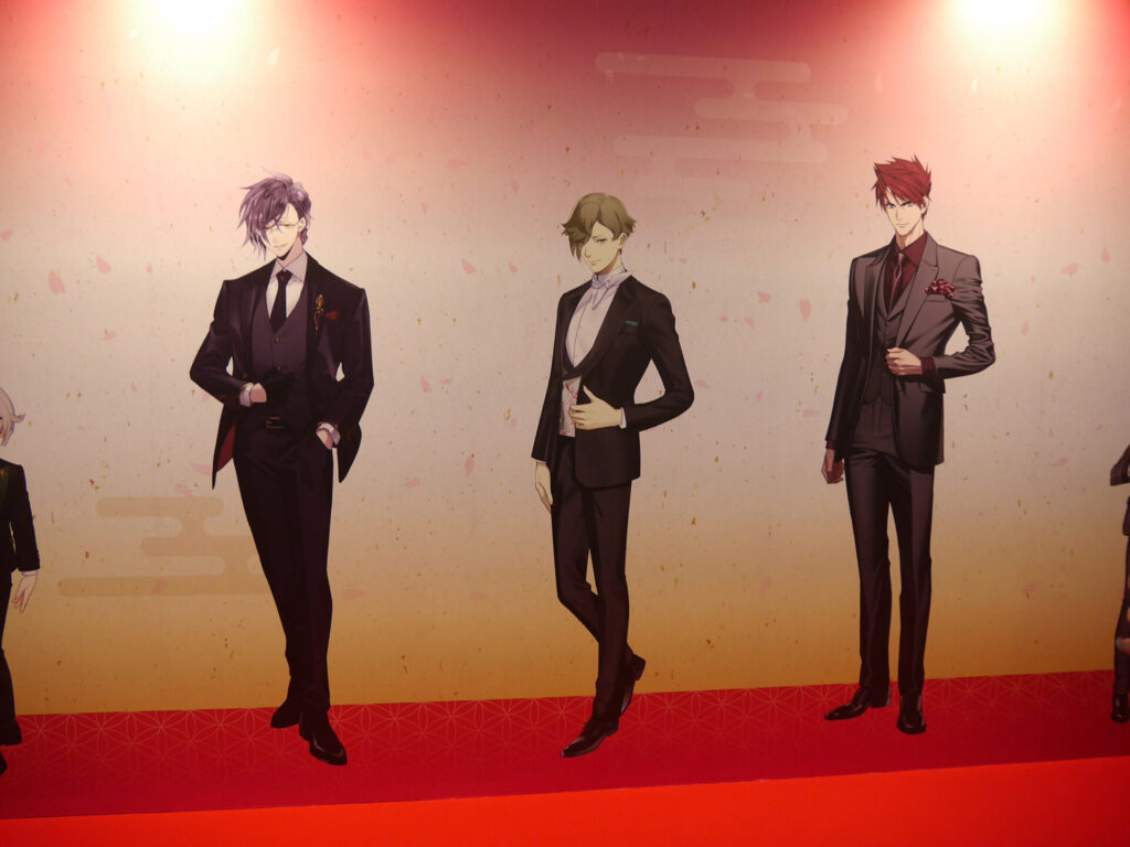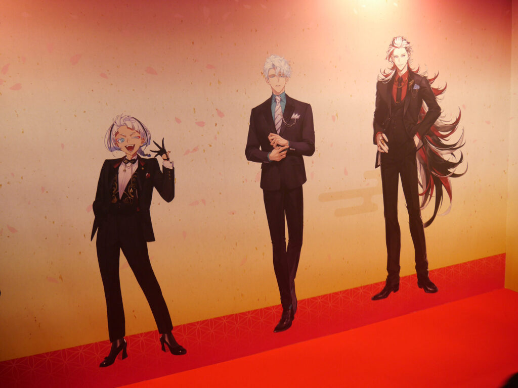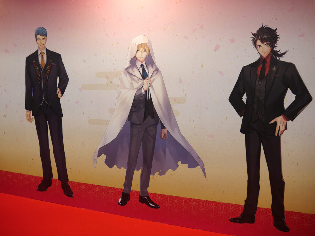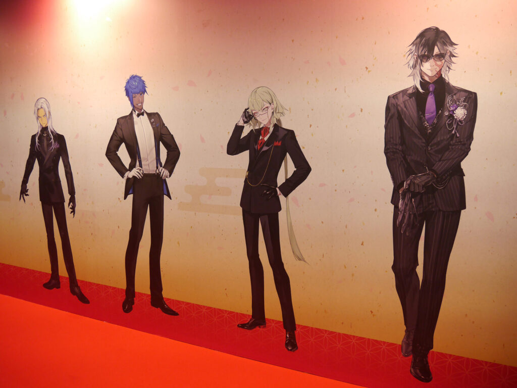 エントランスを抜けると「祝装(十周年記念Ver.)」の刀剣男士とお祝いの生け花が! ゴージャスなさまに多くの審神者が写真撮影をしていました。
