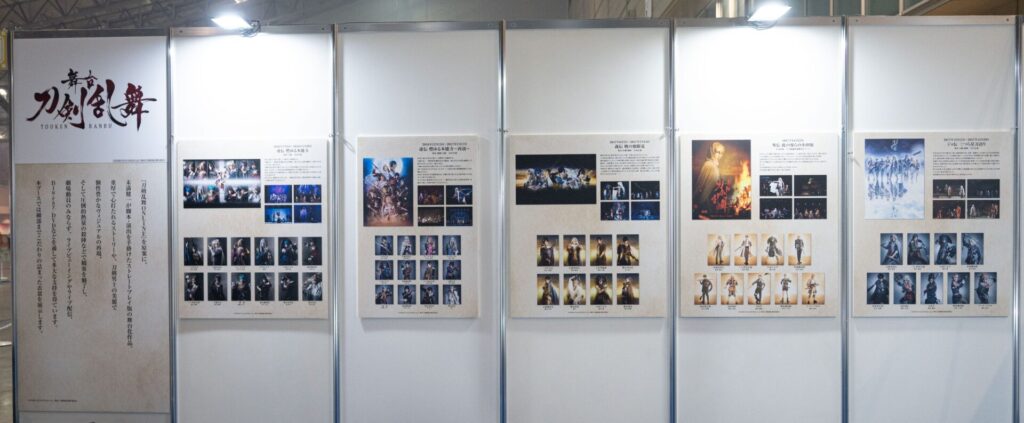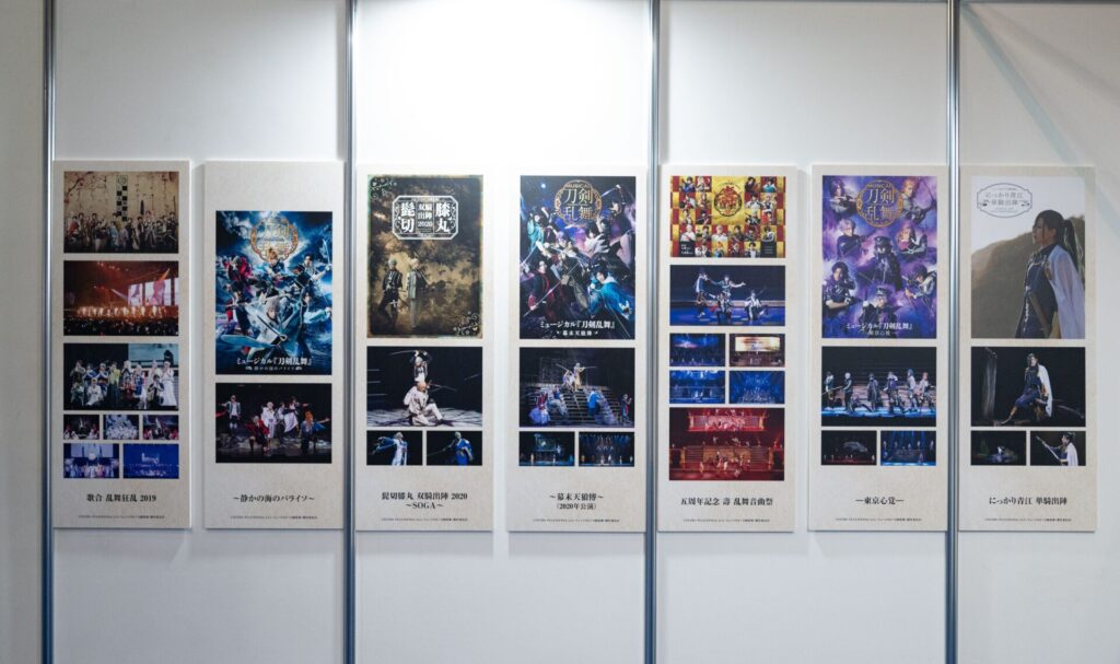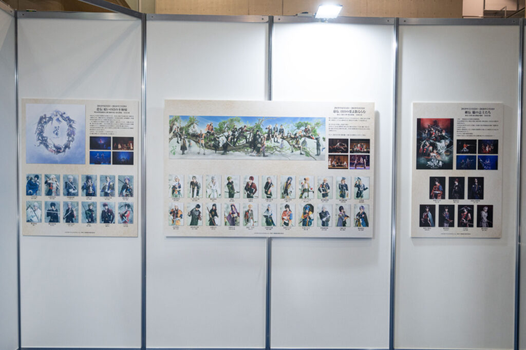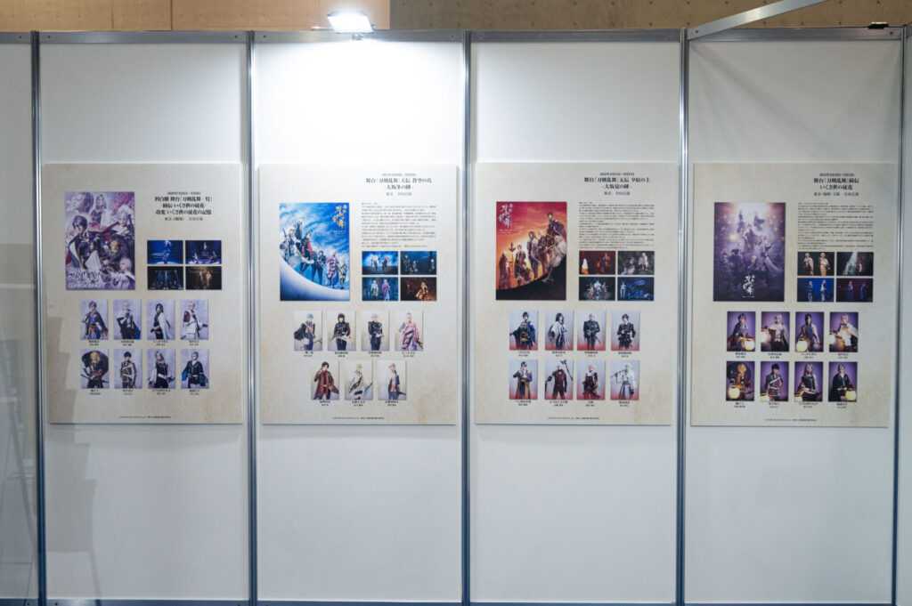 舞台のキービジュアルや舞台版の刀剣男士のビジュアル、公演の写真など思い出が蘇るような展示が。