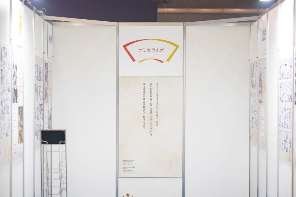オリジナルコミックスやアンソロジーなどのコミカライズなど、これまでのコミカライズを振り返ることができる展示が。先生からのお祝いコメントもありました!