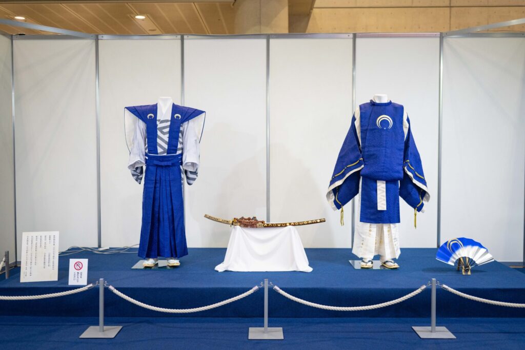 公演のポスターパネルや公演で使用された衣装や扇子、刀の展示が行われていました。
