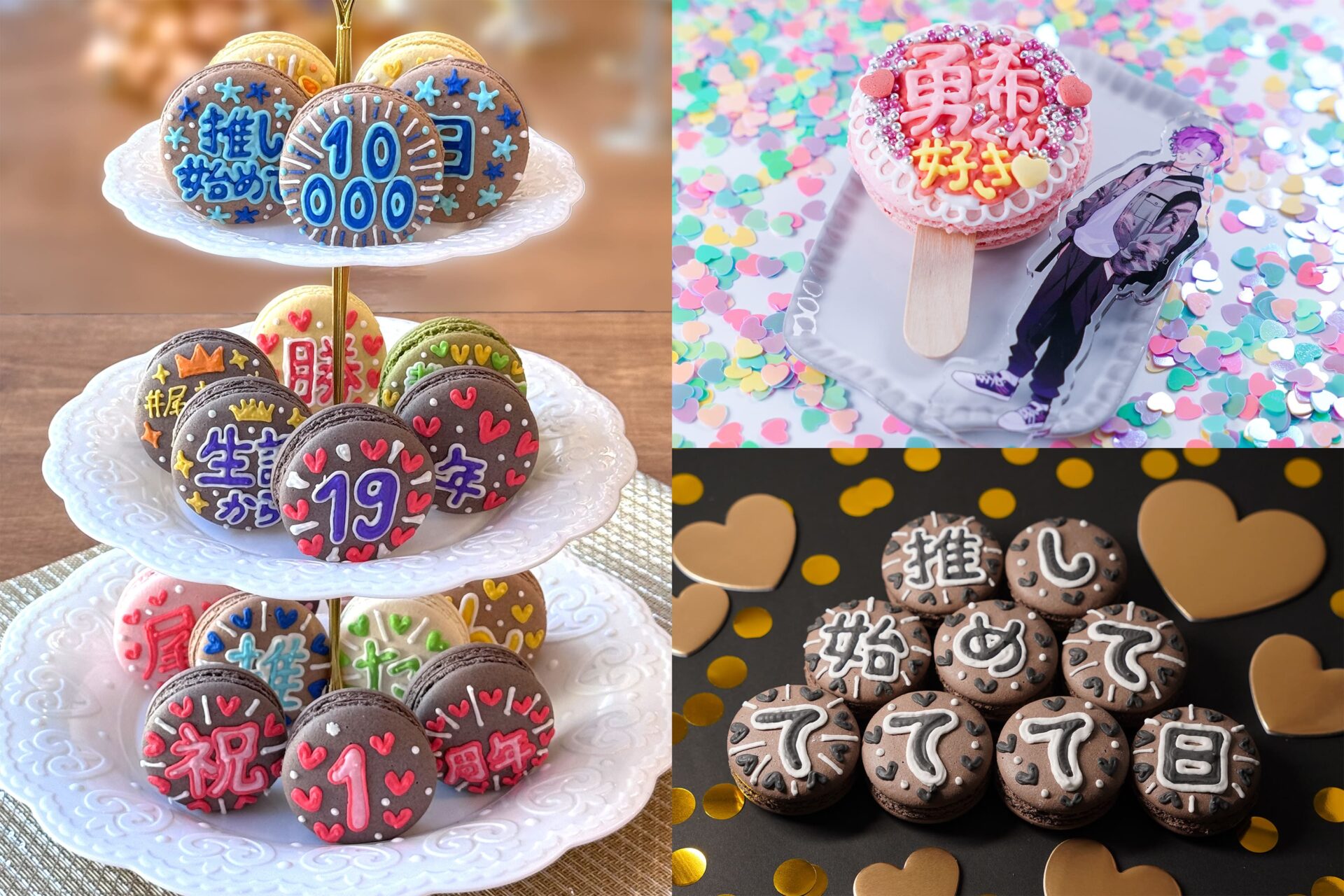 このマカロンは、推しの生誕祭、推し始めた記念日、グループ/チャンネルの結成・配信開始記念日、さらには推し友とのイベントなど、推しに関する多様なお祝いシーンを彩るためのものです。ケーキでは大きすぎたり持ち運びが大変だったりする代わりに、手軽に特別感を演出できるスイーツとして、また、推しグッズ(アクスタやぬいぐるみなど)と一緒に映える写真を撮りたいという推し活のニーズに応えます。
