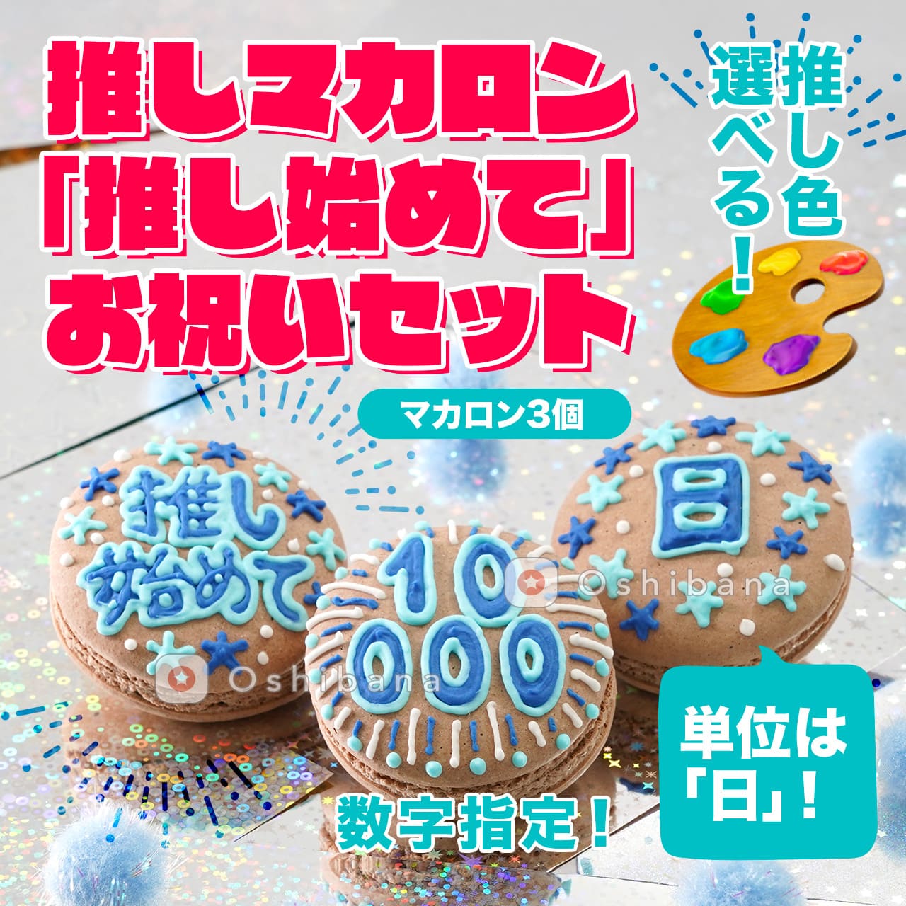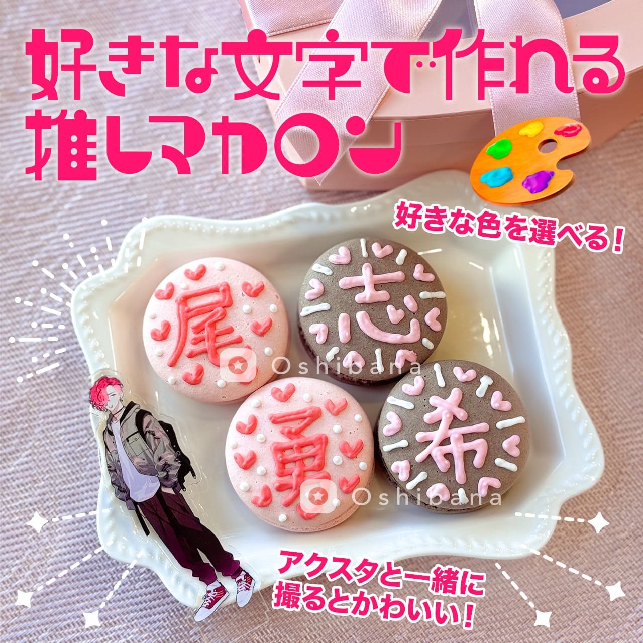 「推しマカロン」は、推し活アプリOshibanaが提案する、推しや推し活の記念日をお祝いするための特別なマカロン。マカロンと、推し色(推しカラー)、推しマークを組み合わせた造語です。