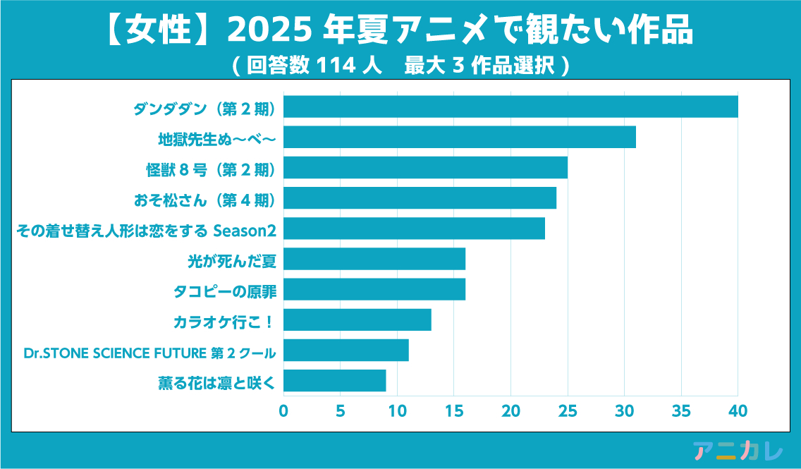 2025年夏アニメ 71作品から見たい作品を1人最大3作品選択できる形式で集計され、「女性が観たいTOP10」「男性が観たいTOP10」「総合TOP10」の3つに分けて結果発表されました。