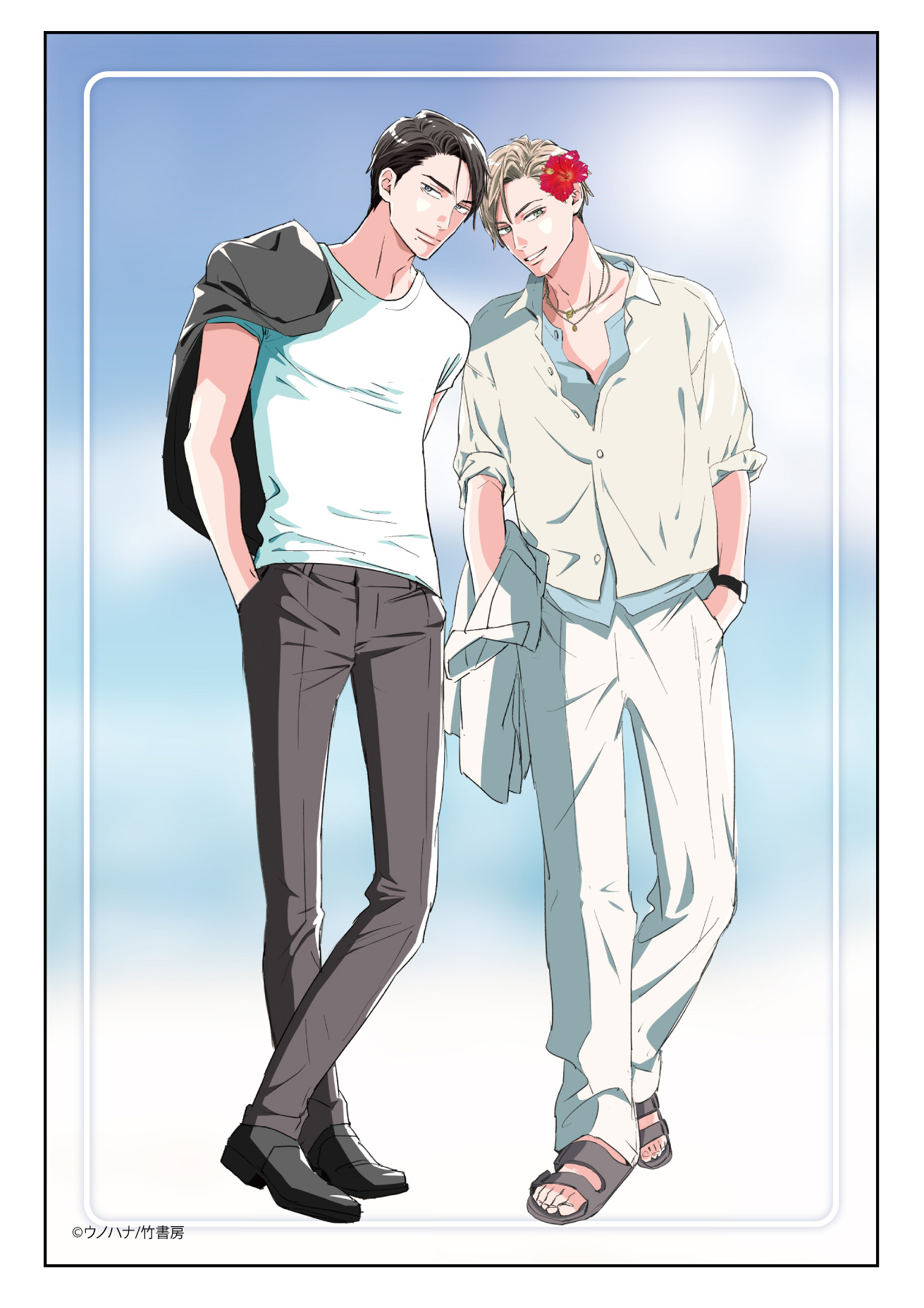 顔を寄せ合い、周囲に見せつけるように2人だけの甘い世界を作る忍と東湖。いつもよりラフな格好をした忍、そして耳元にハイビスカスをつけた東湖……夏のバカンスを満喫しているようです! 誰も近づけさせない――そんな2人の絶妙な空気感もたまりません!!