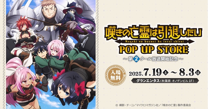 2025年10月からの第2クール放送を記念した「TVアニメ『嘆きの亡霊は引退したい』POP UP STORE~第2クール放送開始記念~」が、秋葉原・グランエンタスで開催されることも明らかに。