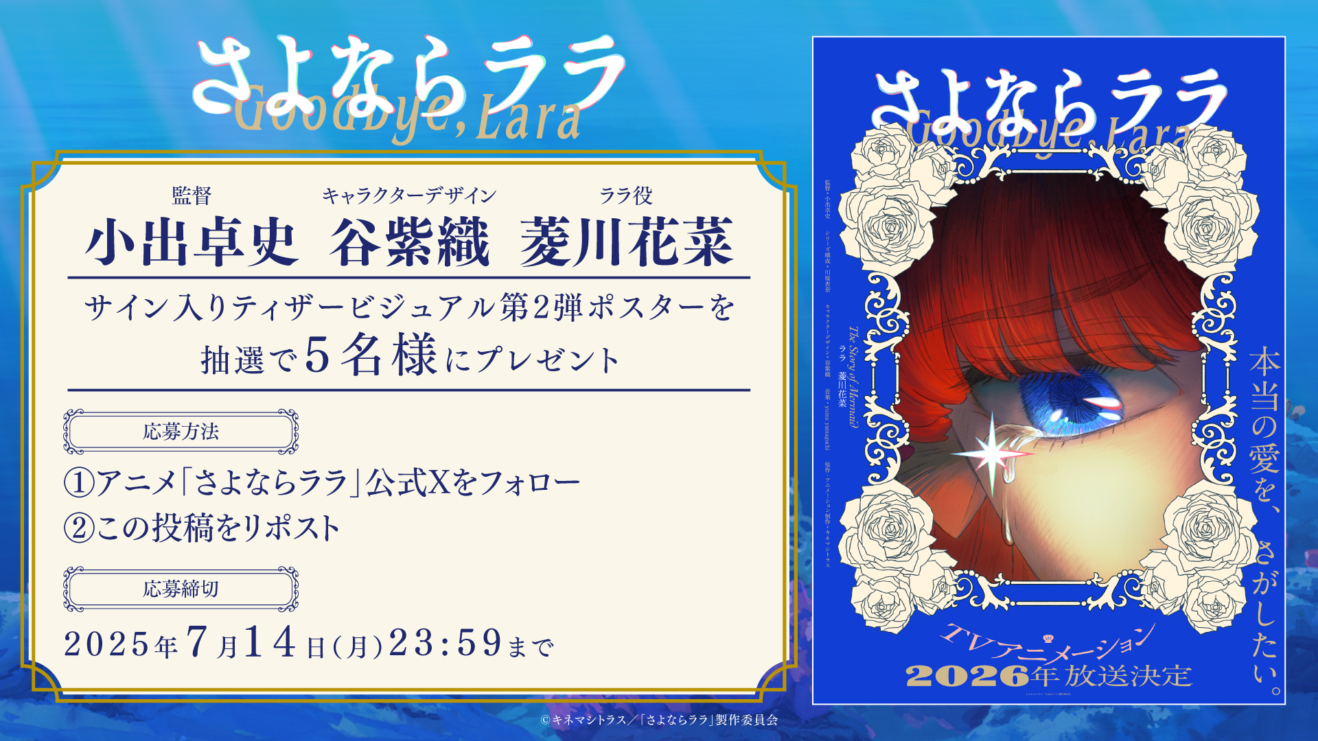 アニメ公式X(@Goodbye_Lara)をフォロー&該当の投稿をリポストすると、抽選で5名に監督の小出卓史氏、キャラクターデザインの谷紫織氏、ララ役の菱川花菜さんのサイン入りティザービジュアル第2弾ポスターが当たるとのことなので、キャンペーンにもぜひ応募してみましょう!
