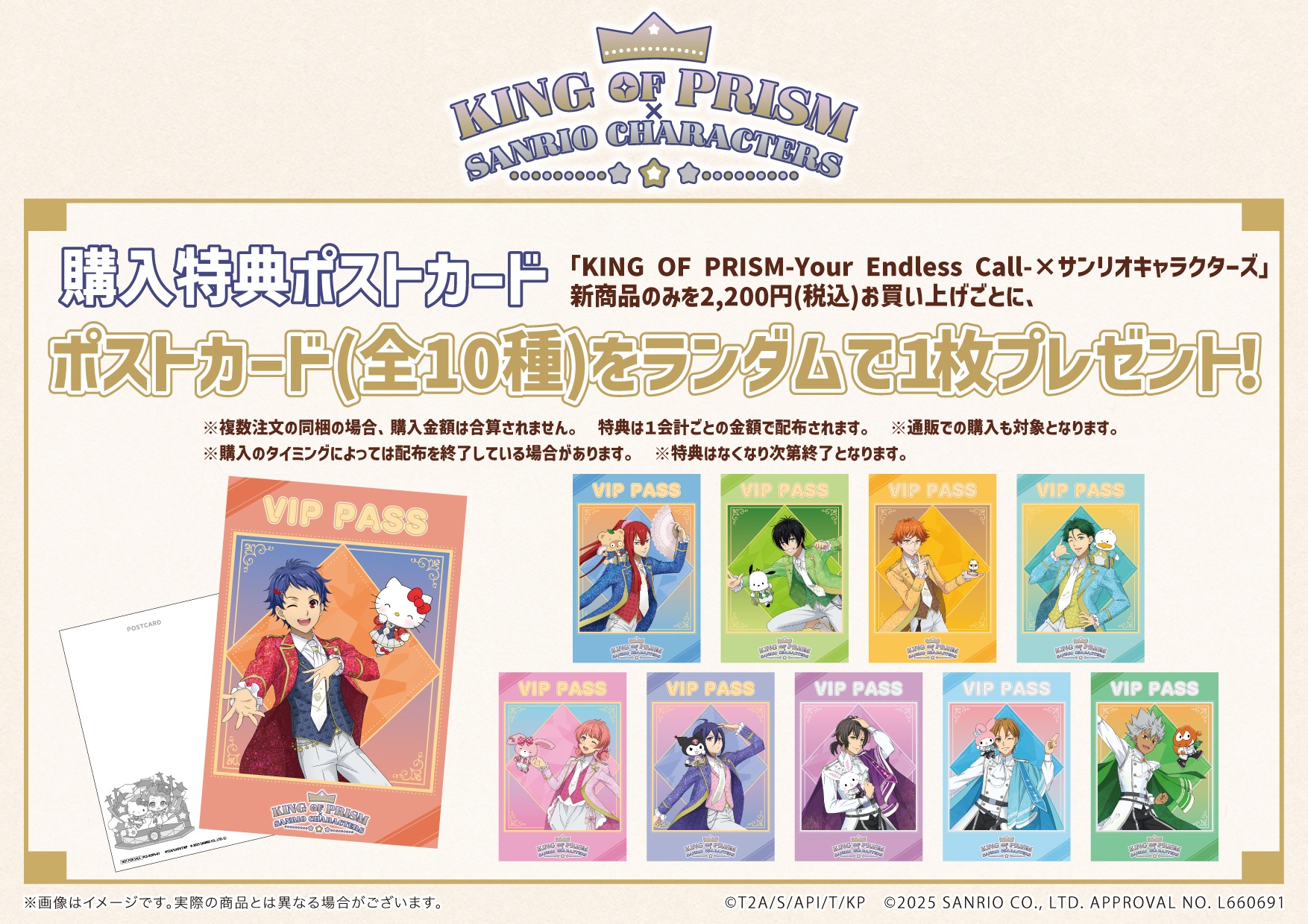 「KING OF PRISM-Your Endless Call-×サンリオキャラクターズ」新商品のみを1会計2,200円(税込)お買い上げごとに、購入特典としてポストカード(全10種)をランダムで1枚プレゼント。