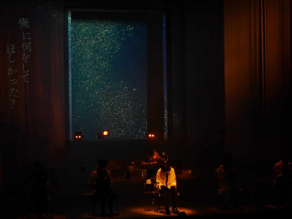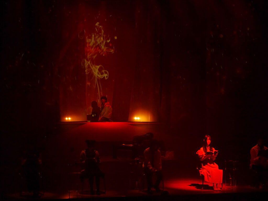 また、ステージ上に設置されたスクリーンや紗幕には、シーンに合わせた背景やキャラクターたちの心情を表したかのような映像が投影され、物語をさらに盛り上げます。