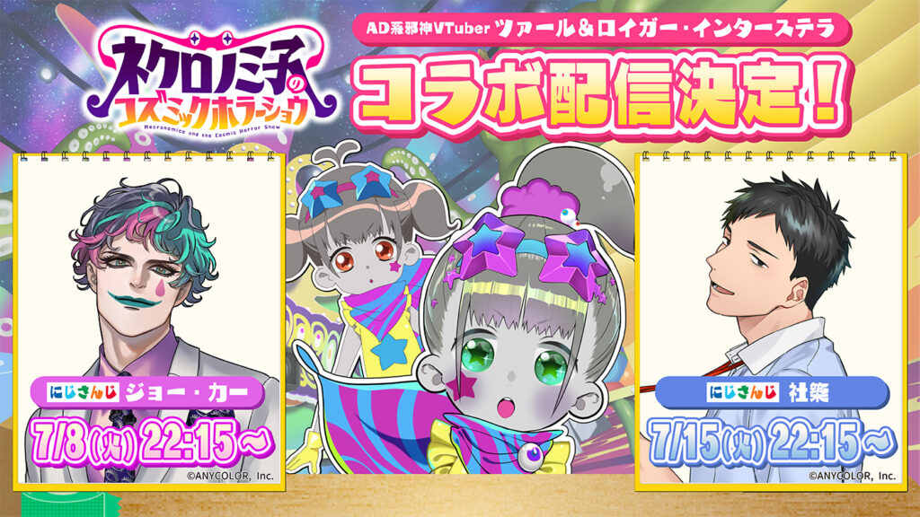TVアニメ『ネクロノミ子のコズミックホラーショウ』の作中では、邪神として登場している本作の公式VTuberのツァール&ロイガー・インターステラさんと、第1話で声優としてゲスト出演された「にじさんじ」所属のバーチャルライバーであるジョー・力一さん&社築さんとのコラボ配信が決定!