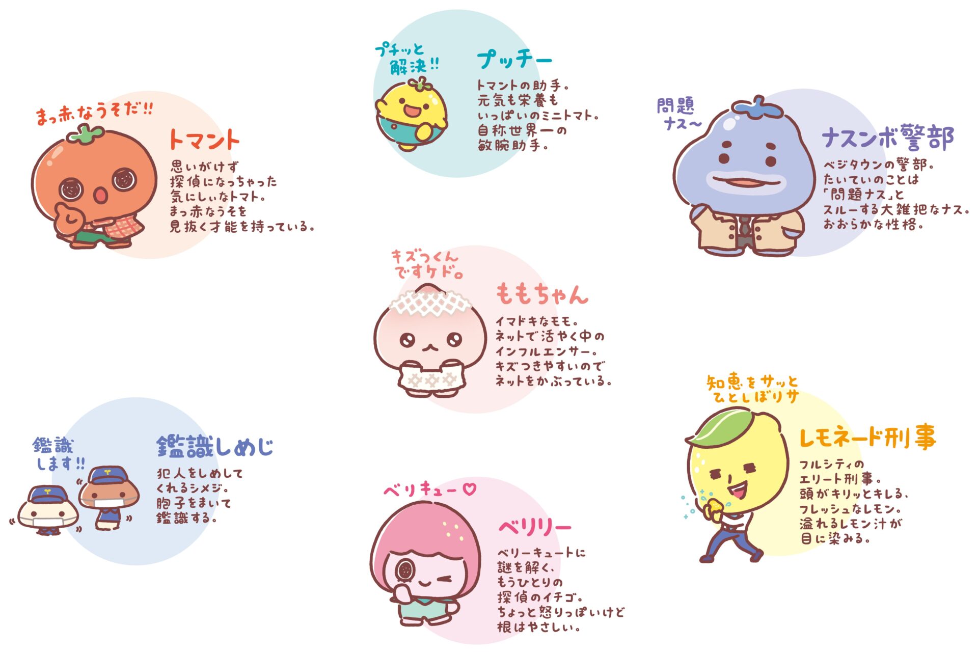 野菜や果物をモチーフとしたユニークなキャラクターたちが登場し、かわいいのに本格的な、わくわくドキドキなミステリーが展開されます。