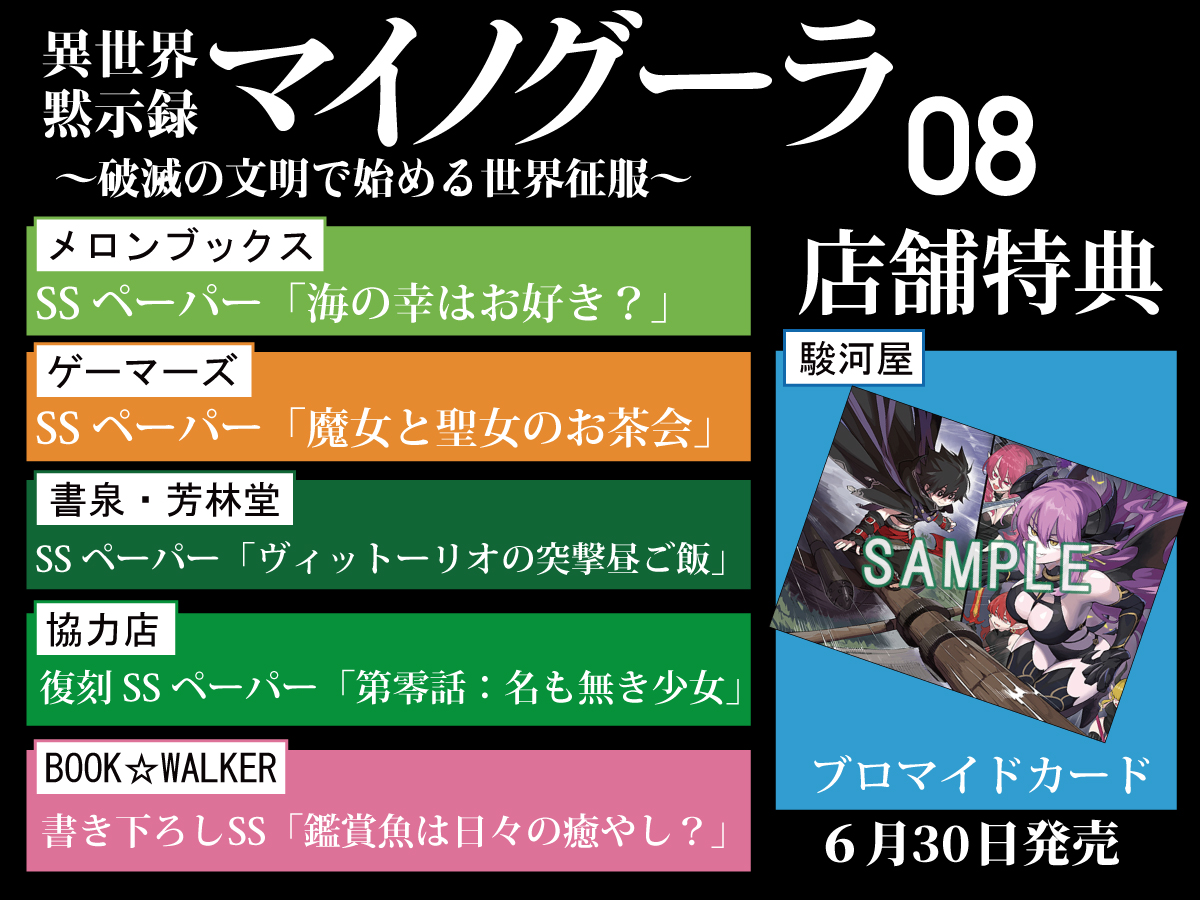 小説『異世界黙示録マイノグーラ~破滅の文明で始める世界征服~』第1巻~第8巻を1冊お買い上げごとに、特製しおり(全2種)がランダムで1枚プレゼントに!