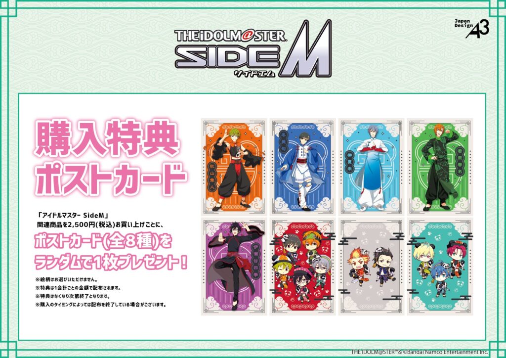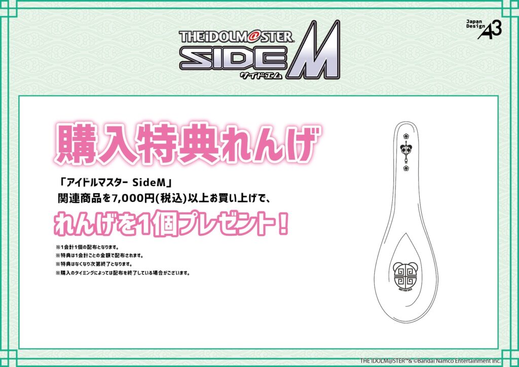 『アイドルマスター SideM』の関連商品を2,500円(税込)お買い上げごとに、ポストカード(全8種)をランダムで1枚プレゼント! また、7,000円(税込)以上お買い上げで、れんげを1個プレゼントします。
