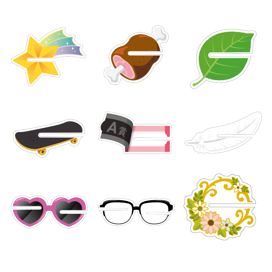 サングラス/めがね/流れ星/骨付き肉/花冠/くじ券/葉っぱ/鳥の羽/スケボー/絵具(全6色)