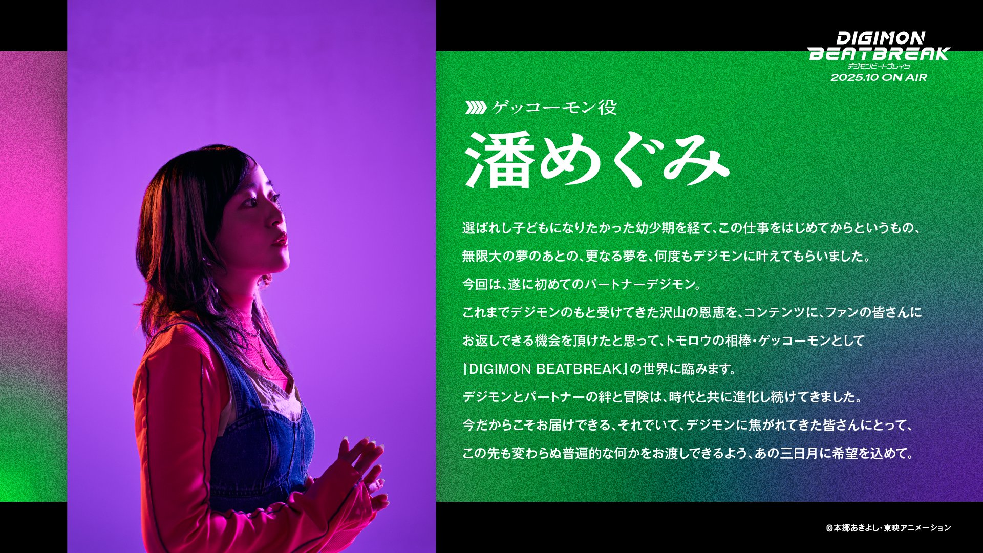 これまでデジモンのもと受けてきた沢山の恩恵を、コンテンツに、ファンの皆さんにお返しできる機会を頂けたと思って、トモロウの相棒・ゲッコーモンとして『DIGIMON BEATBREAK』の世界に臨みます。