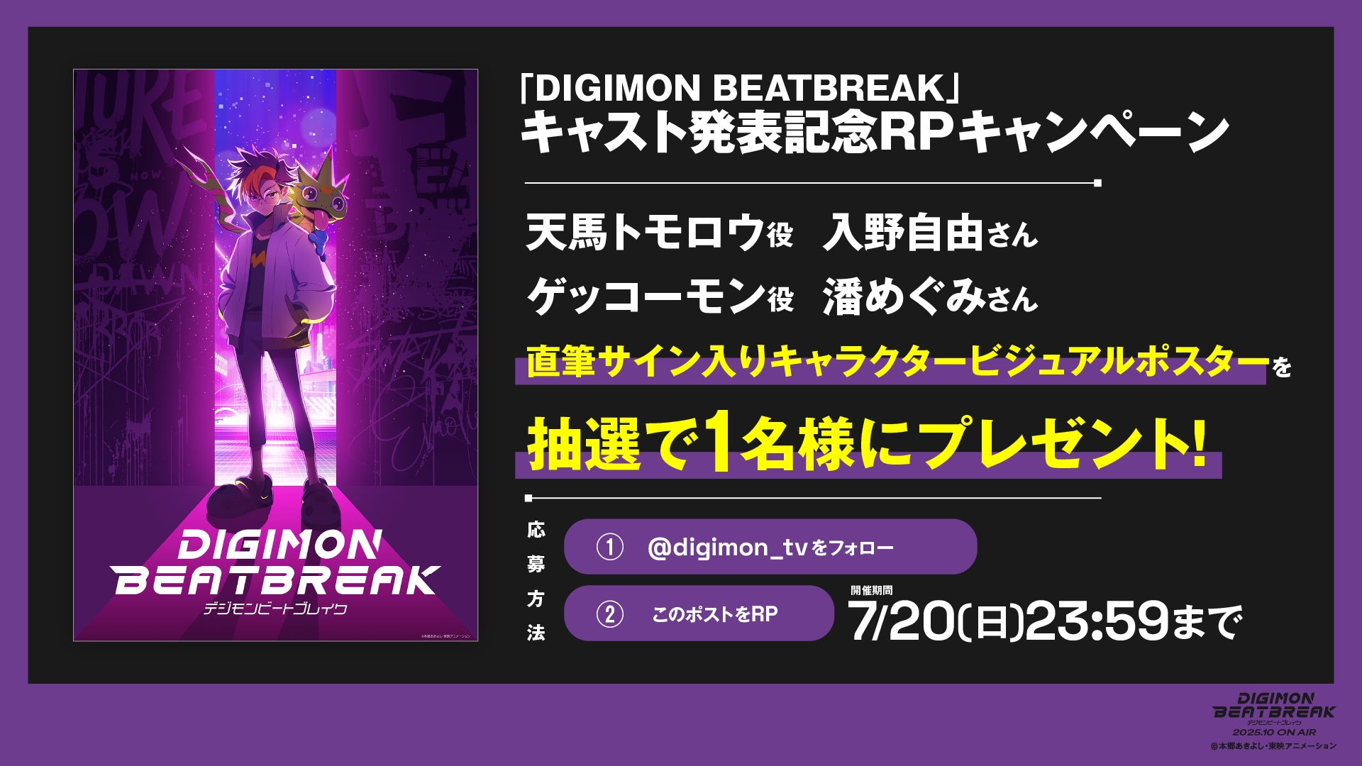 TVアニメ『DIGIMON BEATBREAK』のキャスト発表を記念して、公式X(@digimon_tv)では、入野自由さん&潘めぐみさんの直筆サイン入りキャラクタービジュアルポスターが抽選で当たるフォロー&リポストキャンペーンが開催されています。