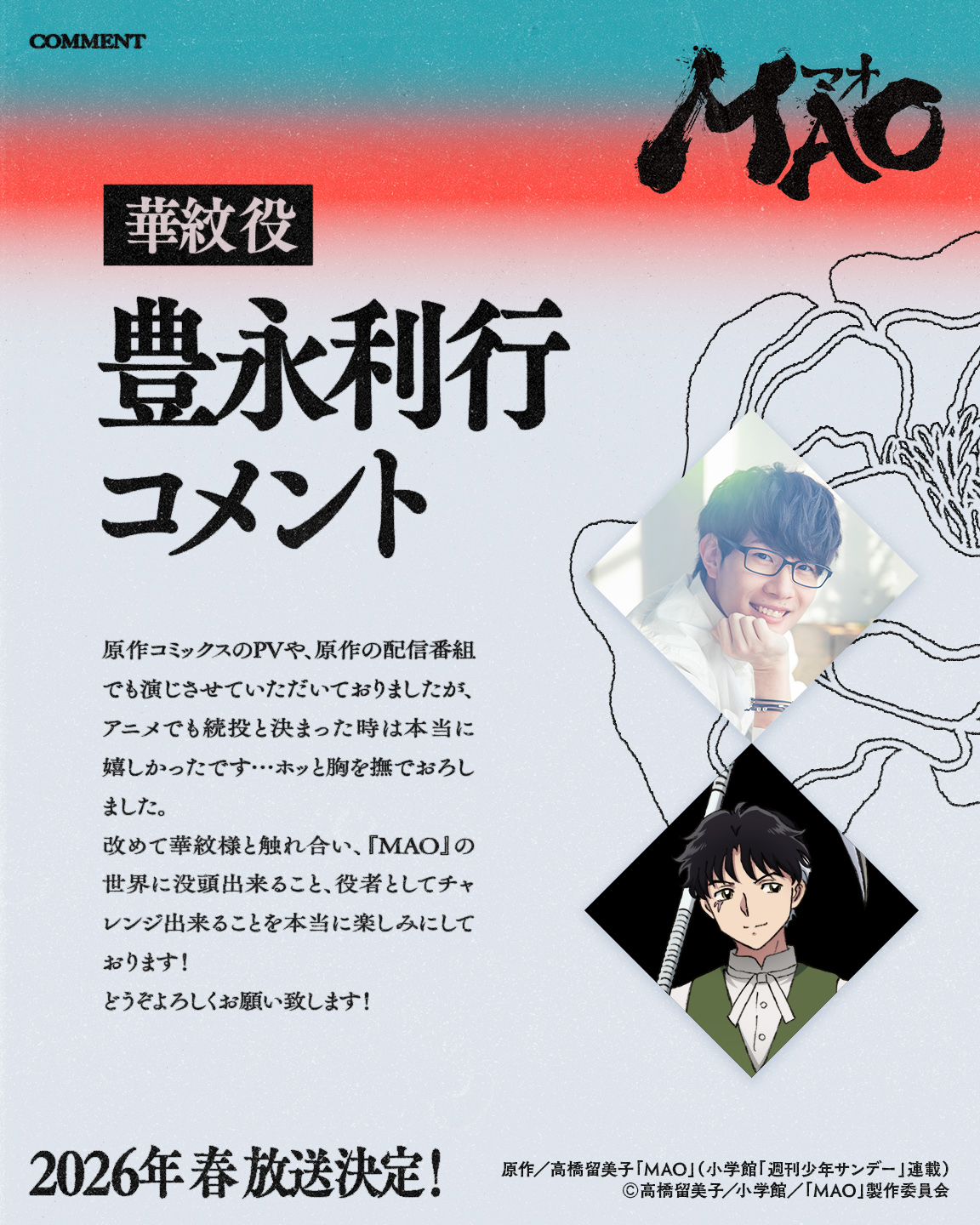 「週刊少年サンデー」(小学館)にて連載中、高橋留美子先生が手掛ける漫画『MAO』。同作が2026年春にTVアニメ化されることが決定しました! またアニメーション制作を、高橋留美子先生原作作品では「犬夜叉シリーズ」以来となる、サンライズが手掛けることも明らかに。