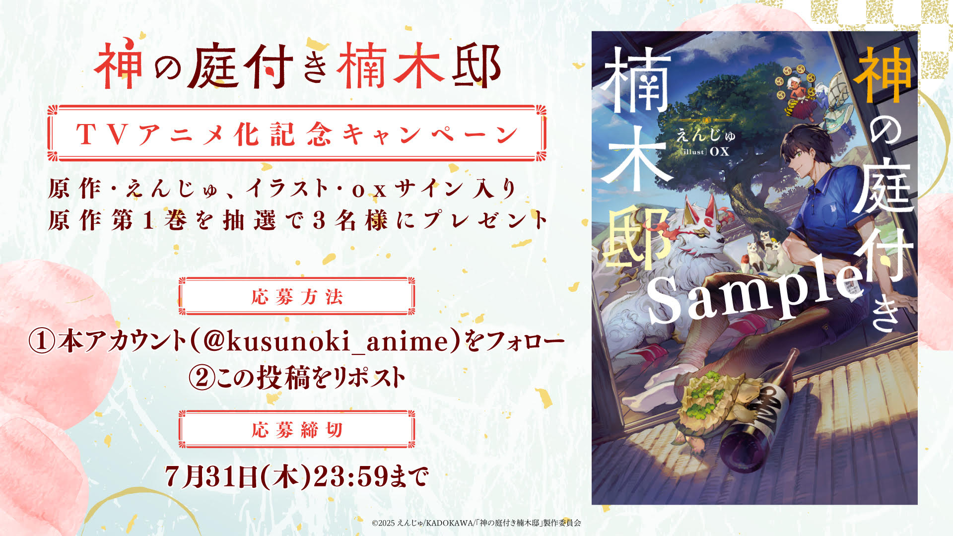 アニメ公式X(@kusunoki_anime)をフォロー&該当の投稿をリポストすると、原作・えんじゅ先生、イラスト・ox先生のサイン入り原作単行本第1巻が抽選で3名に当たるとのことなので、この機会にキャンペーンにもぜひ参加してみましょう!