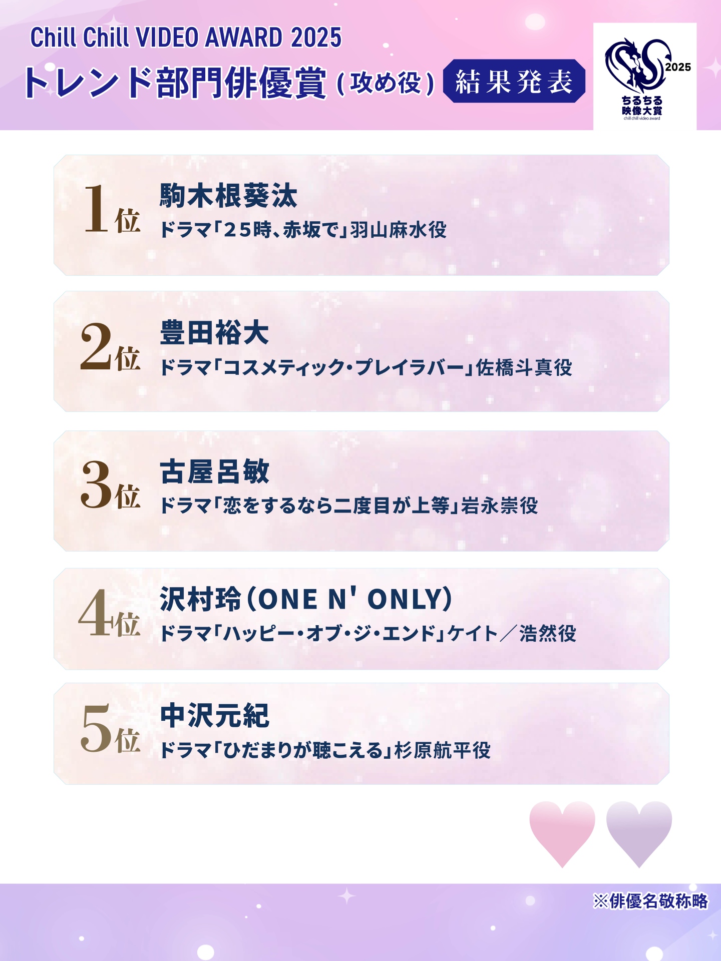 トレンド部門 俳優賞(攻め役)では、華やかかつ繊細な演技で視聴者の心を揺さぶったドラマ『25時、赤坂で』の羽山麻水役・駒木根葵汰さんが1位にランクイン。高い表現力が放送終了後も話題を呼び、今なお国内外で根強い支持を獲得しています。