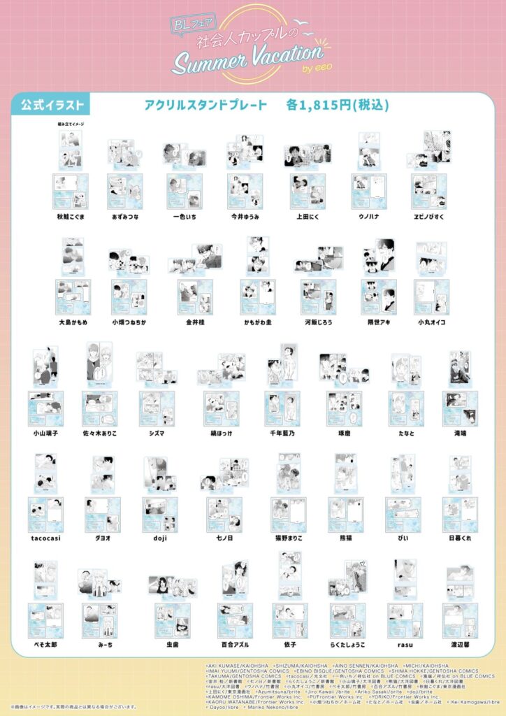 【出版社12社×人気作家38名】が大集結し、eeo Store池袋本店を貸し切って大々的に開催される本フェアでは、新作グッズの販売をはじめ、描き下ろしイラストの複製原画の展示やフォトスポットの設置、ガラポン抽選会など様々な企画を実施しています。