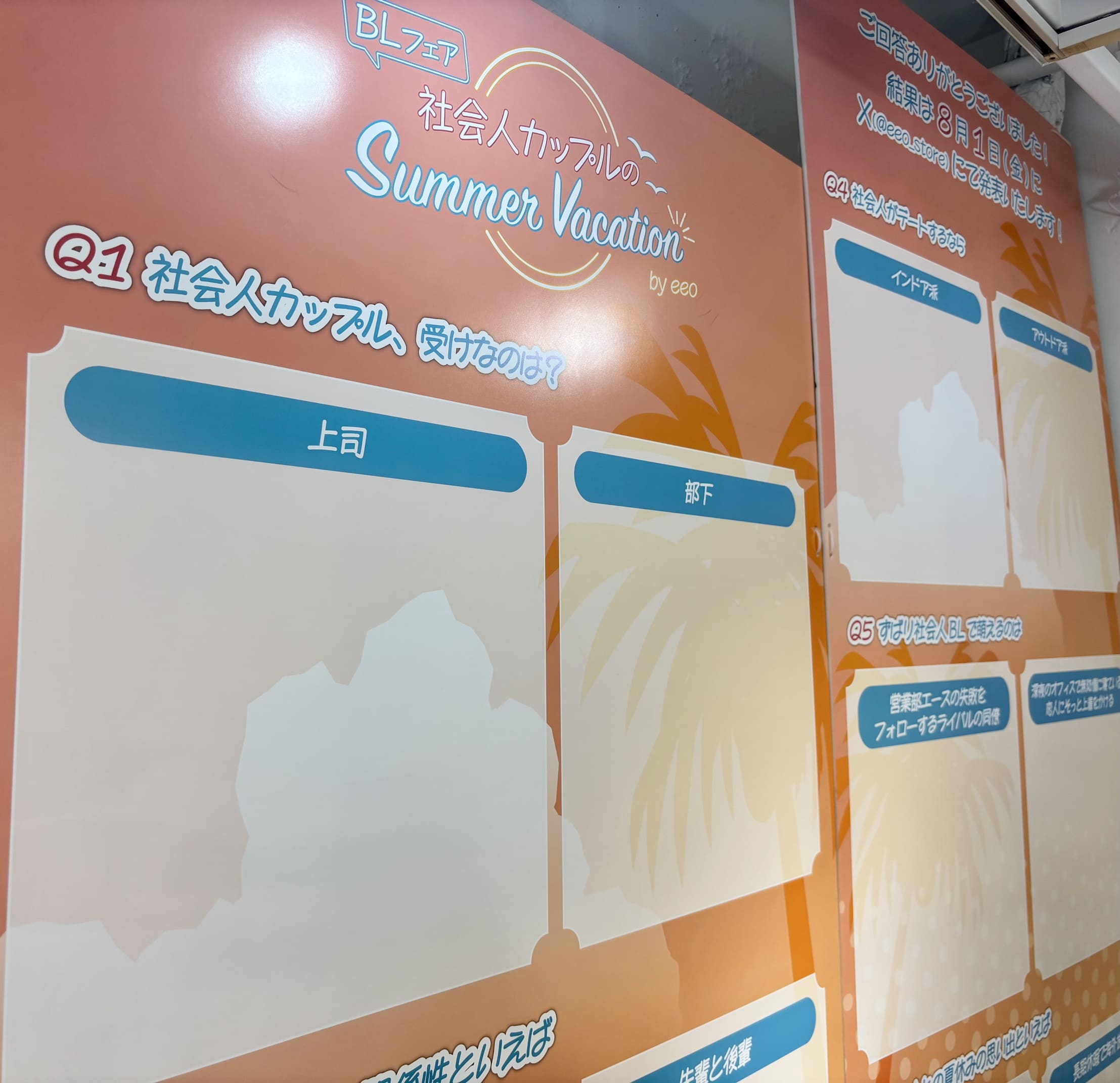 描き下ろしイラストを使用した新作グッズを購入できるだけでなく、フォトブースやアンケート企画など“行って楽しめる”企画が大充実しているBLフェア「社会人カップルのSummer Vacation」by eeo。