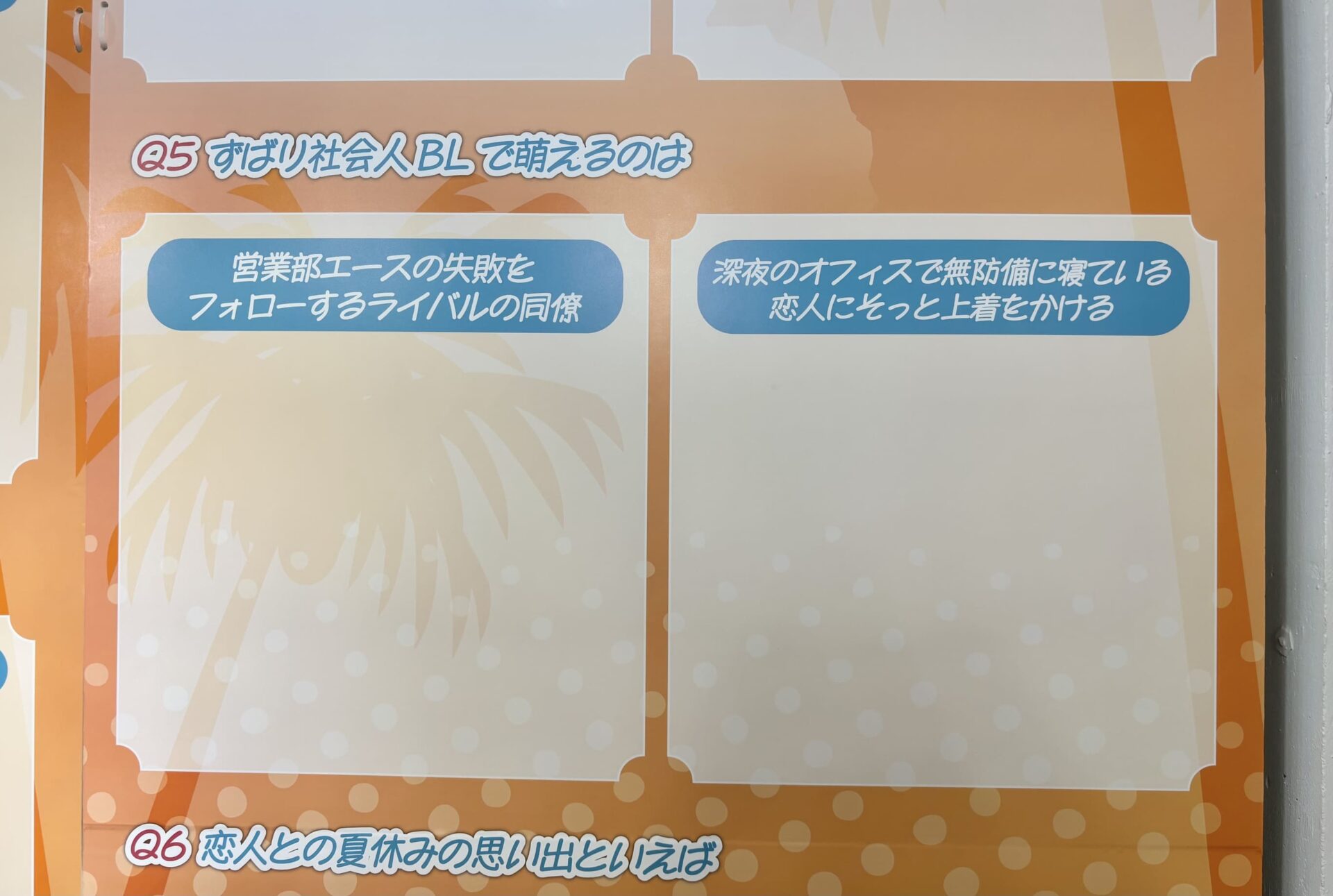 己の魂に従って、ボード上の解答欄にぜひシールを貼ってみましょう!! 皆さんの回答次第で社会人BLの世論(eeo Store池袋本店内)が決まる――かもしれません。