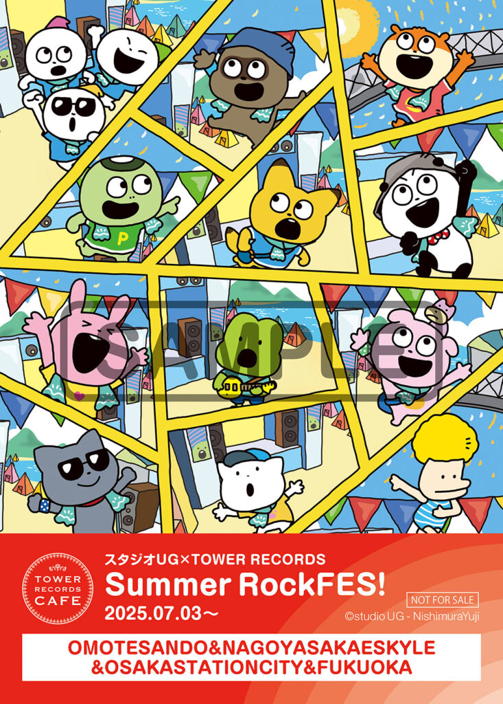 タワーレコードとクリエイターのにしむらゆうじさんが描く「スタジオUG」の仲間たちとのコラボカフェ第2弾が、7月3日(木)からTOWER RECORDS CAFE 表参道店、名古屋栄スカイル店、大阪ステーションシティ店、福岡店で開催です!