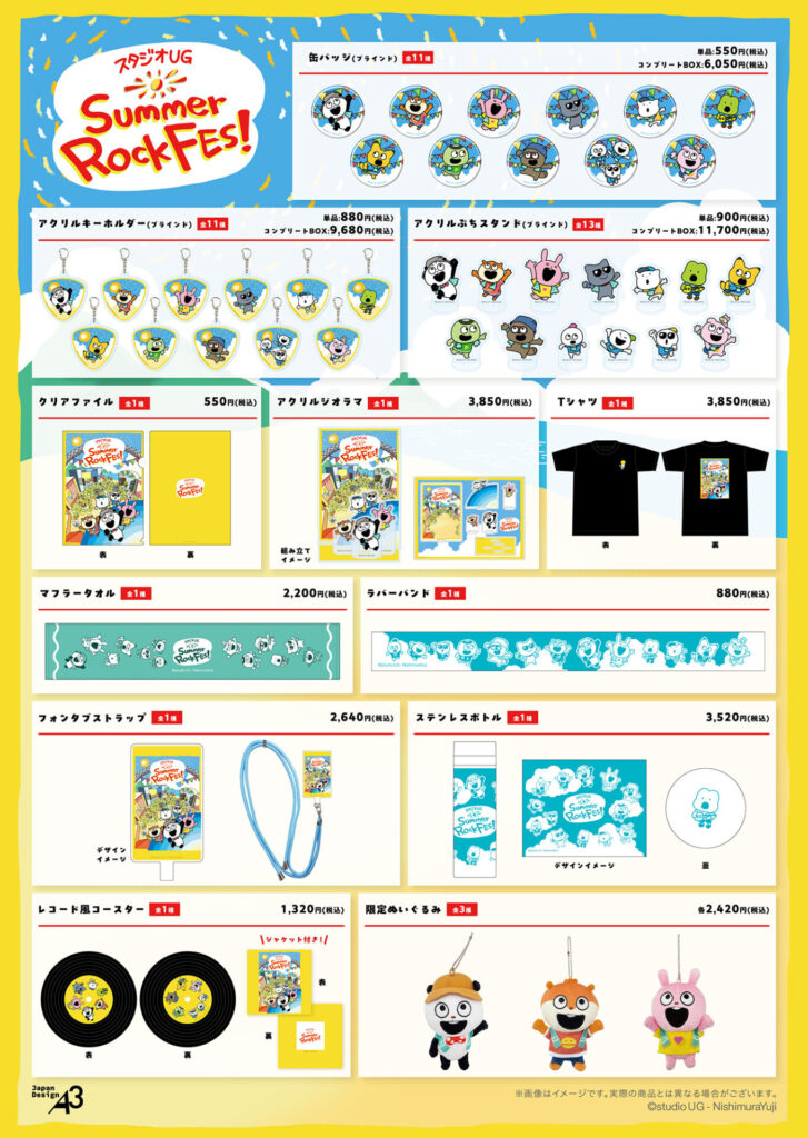 コラボカフェでは“Summer Rock Fes!”をテーマに、それぞれのキャラクターがモチーフとなった限定メニューが提供され、オリジナルの描き下ろしイラストを使用した特典配布も。また、店内ではフォトプロップスになった「スタジオUG」の仲間たちがお出迎え! 入場者はオリジナルイラストのコラボグッズの購入もできます。