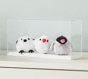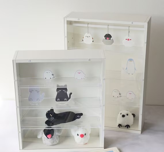 前面のアクリル板は、マグネットで簡単に取り外し可能! 飾るグッズに合わせてダボで棚位置を調節することもできます。