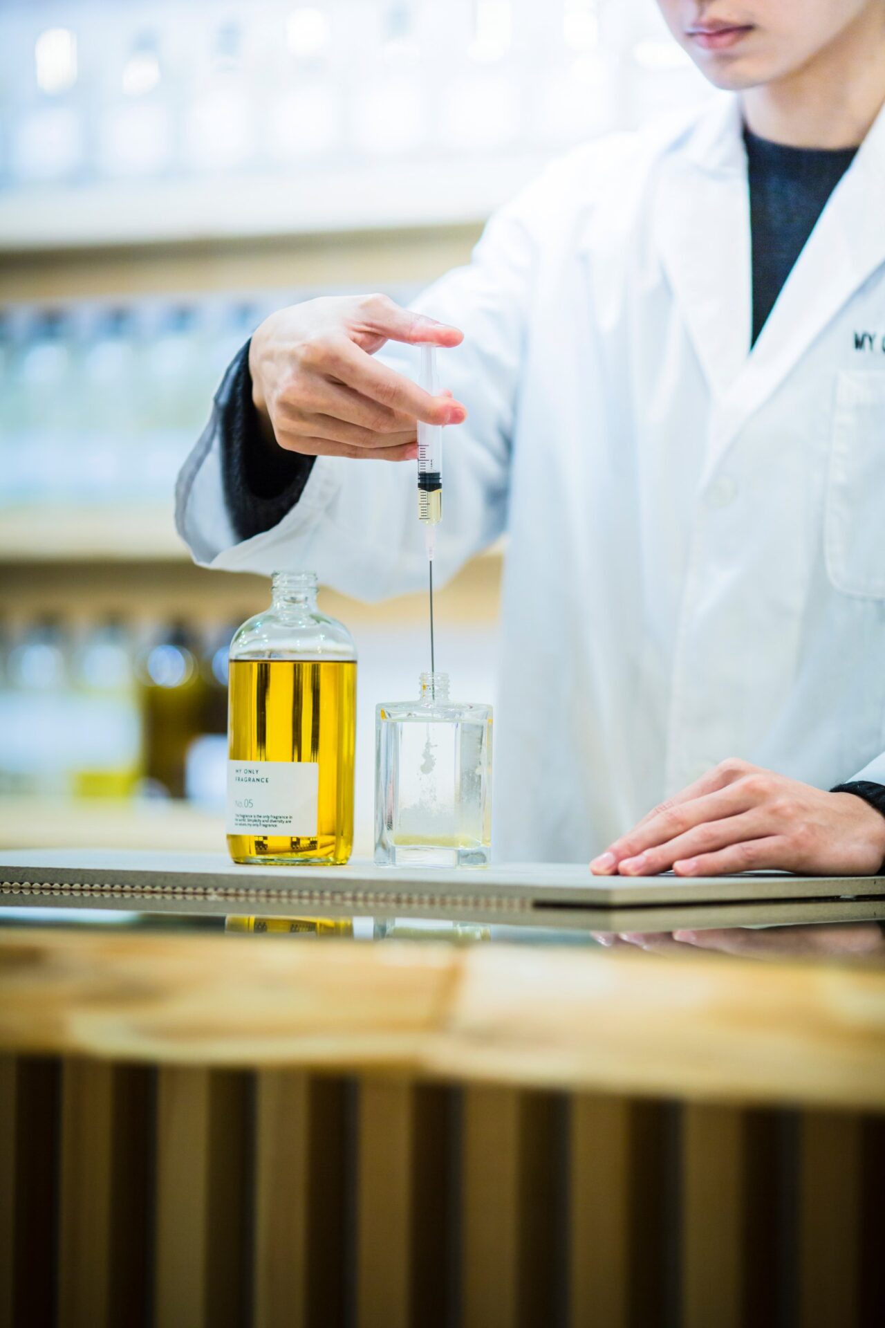 自分だけの特別な香りになるように、アドバイザーと話しながら目の前で香りを調合してもらいます。たった一滴で変わる、香りの奥深さをぜひご体感ください!
