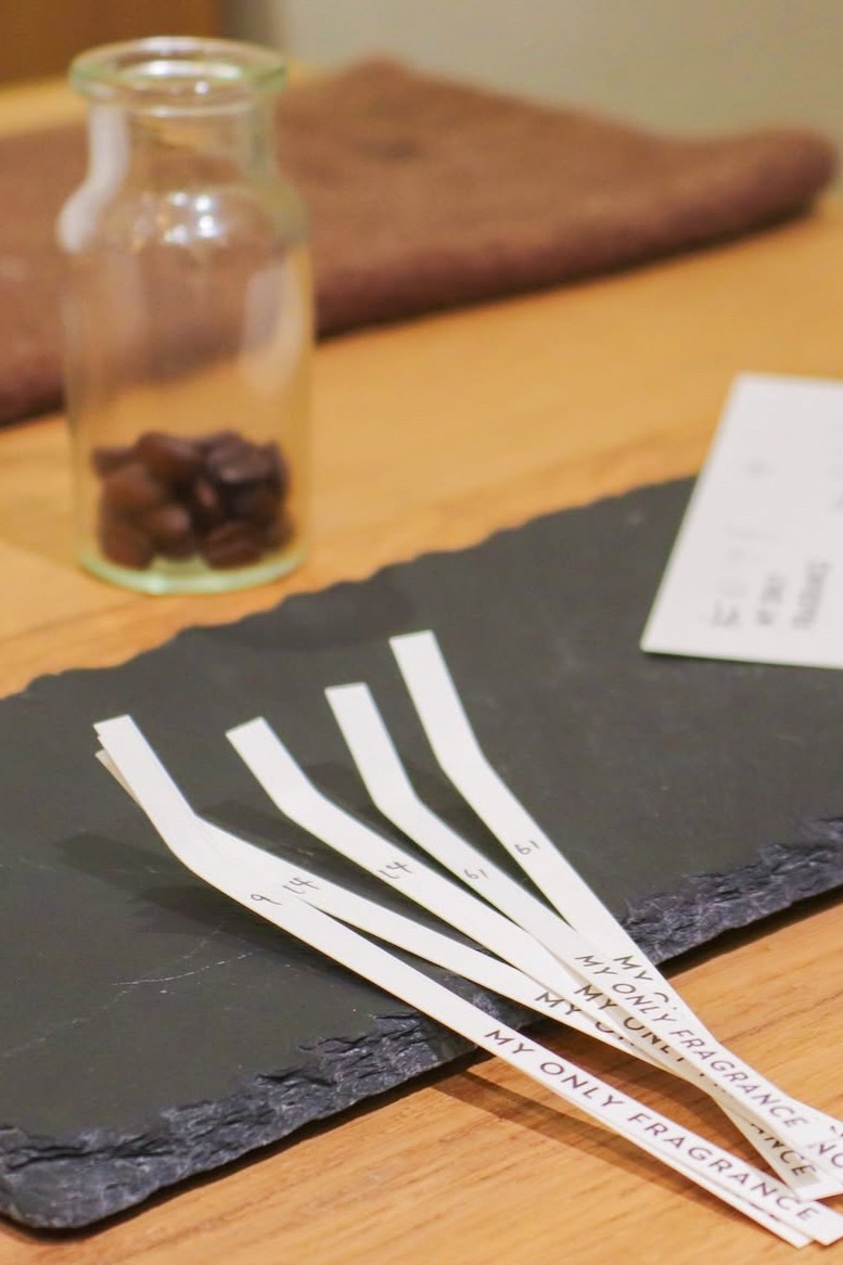 選んだ香りを実際にムエットに吹き付け、香りを試します。制限が無いので、納得できるまで試すことができるのも嬉しいポイント。