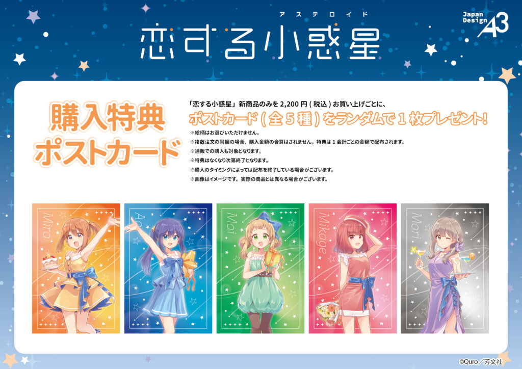 今回発売した『恋する小惑星』の新作グッズを2,200円(税込)お買い上げごとに、ポストカード(全5種)をランダムで1枚プレゼントします。