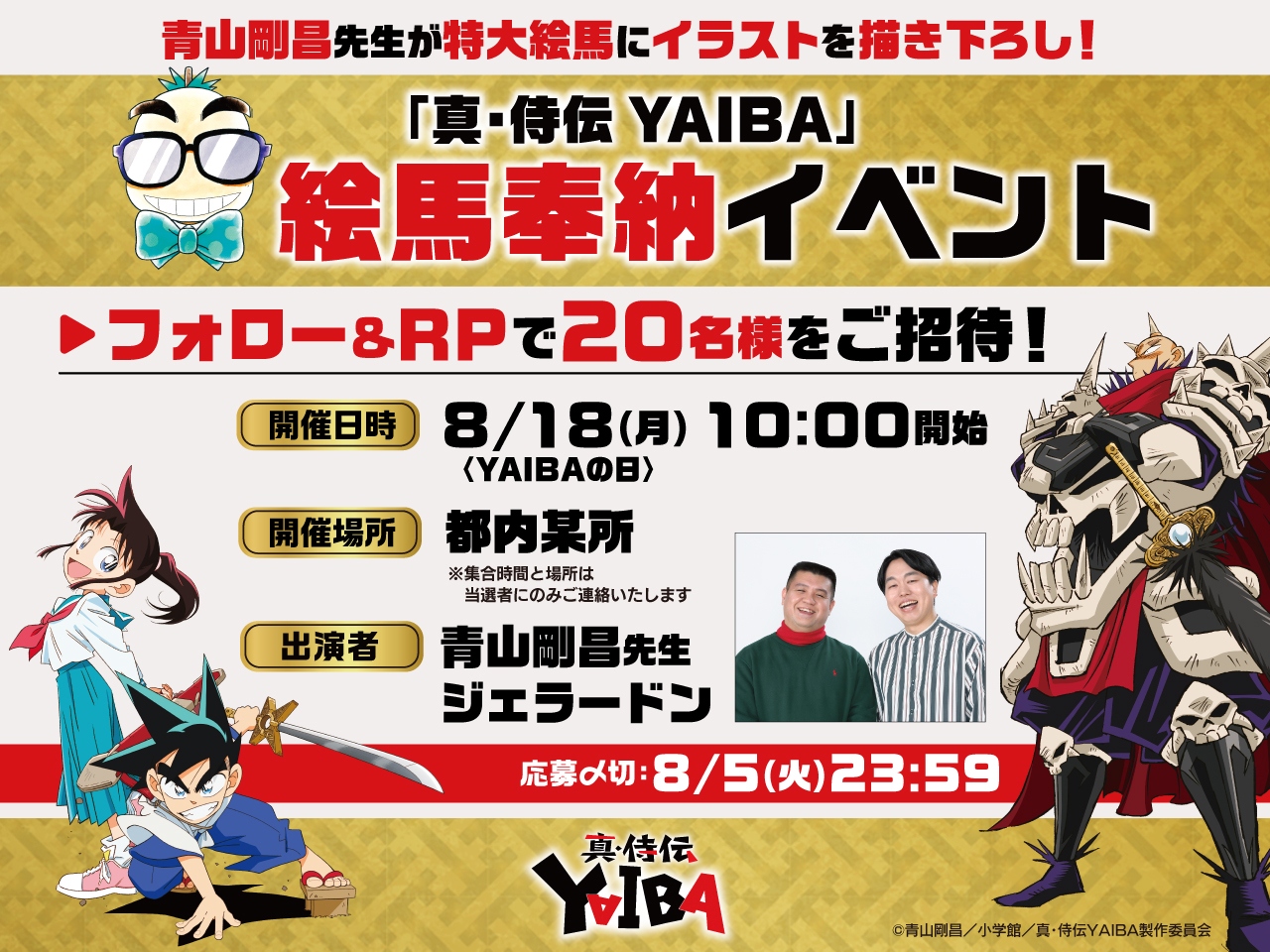 2025年8月18日(月)「YAIBAの日」に、『真・侍伝 YAIBA』絵馬奉納イベントが実施されることが決定しました。当日は青山剛昌先生が登壇されるほか、お笑いコンビ「ジェラードン」のアタック西本さん、かみちぃさんも登場!