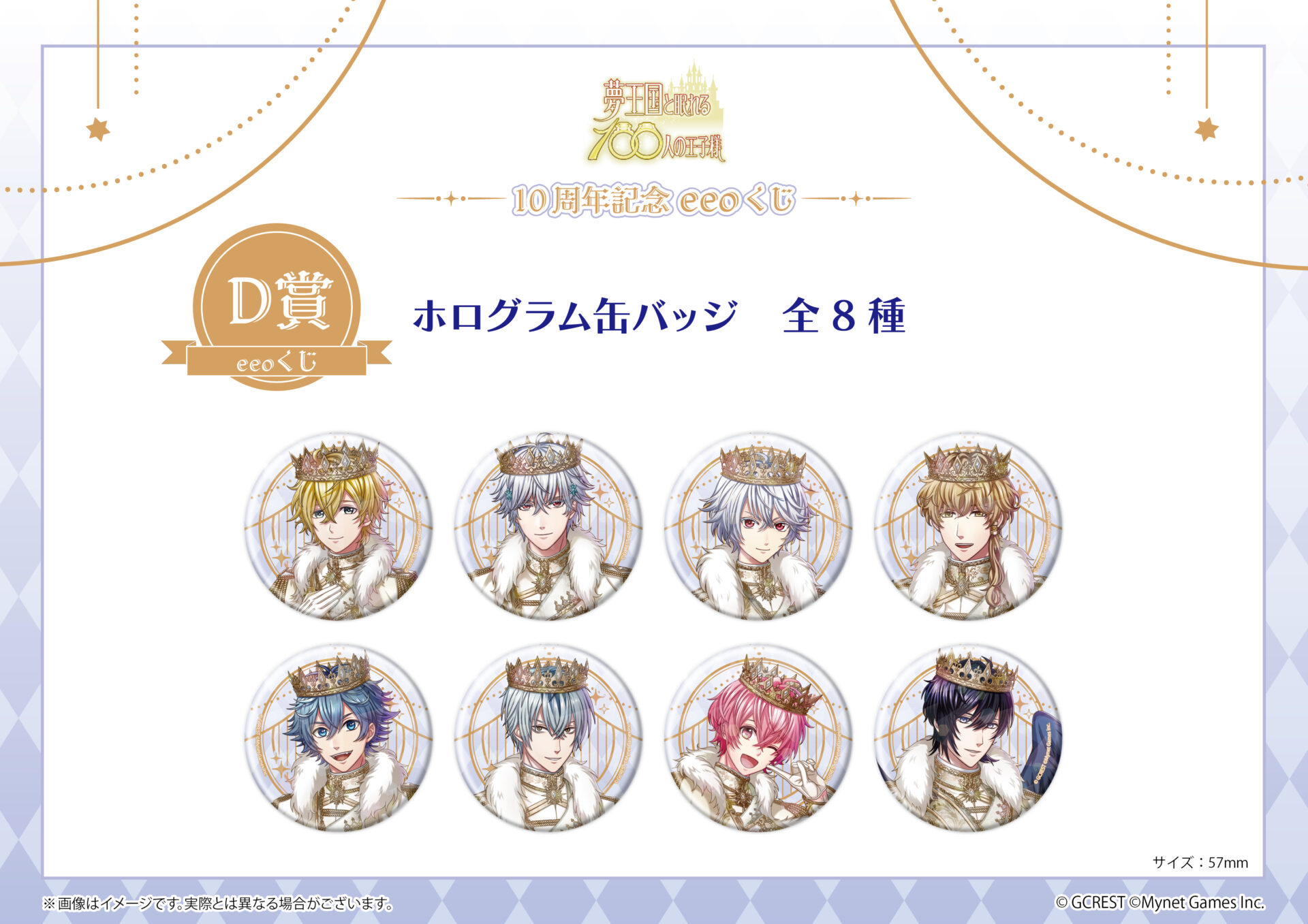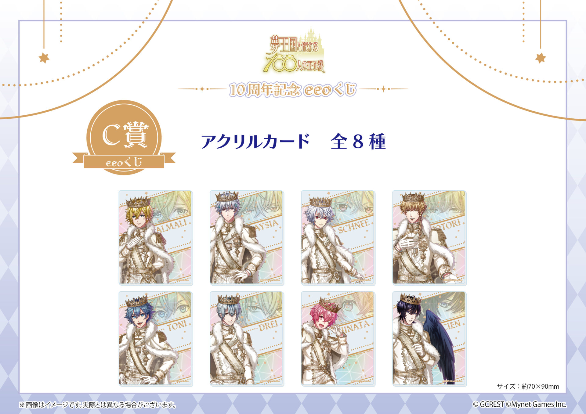 「eeoくじ」には、「10周年Ver.王子様」の公式ビジュアルを使用した景品がラインナップ! アルマリ、グレイシア、シュニー、トトリ、トニ、ドライ、ヒナタ、ルシアンが豪華な衣装を身にまとって登場しました。
