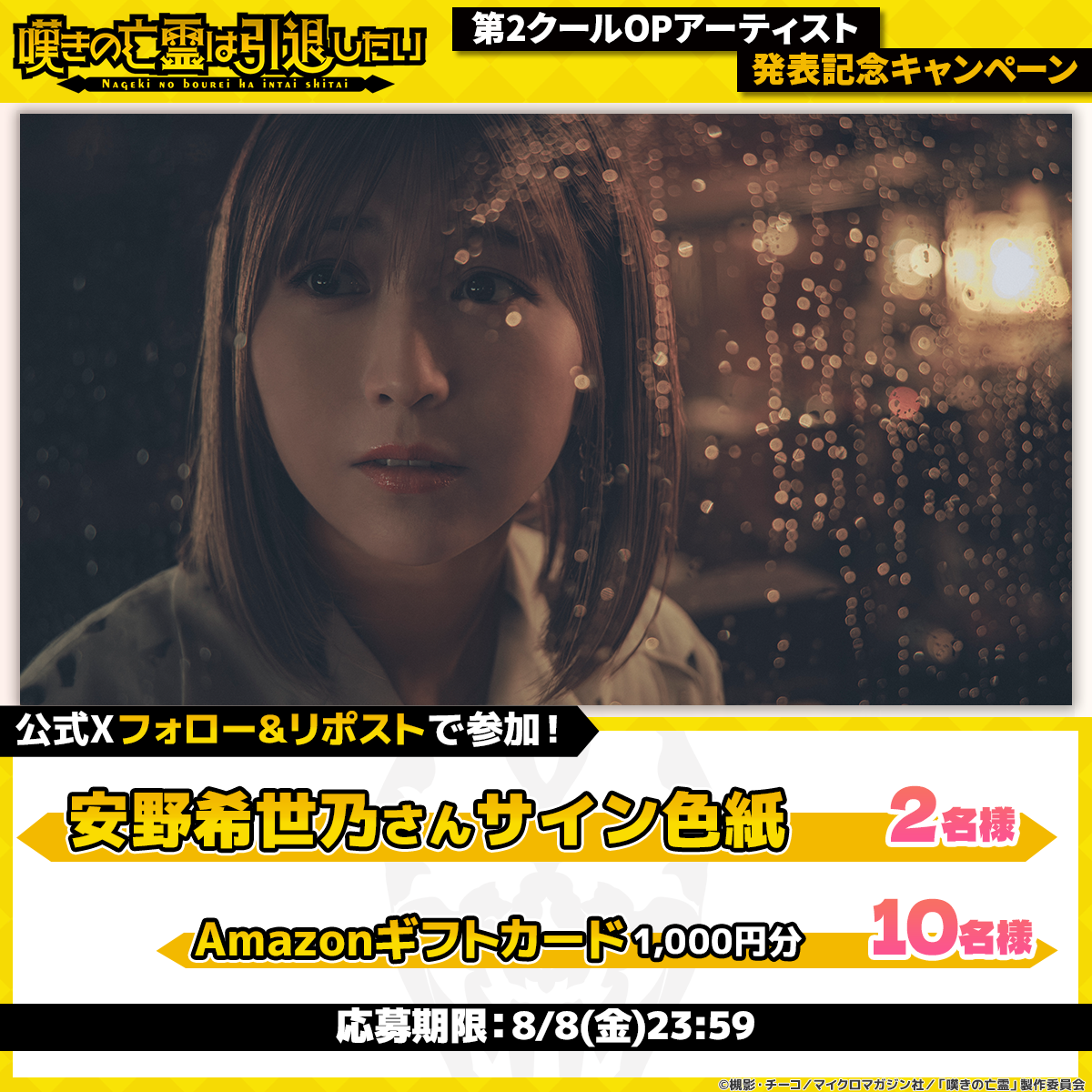 主題歌情報解禁を記念して、作品公式X(@nageki_official)で安野希世乃さんの直筆サイン色紙が当たるキャンペーンがスタートしました。
