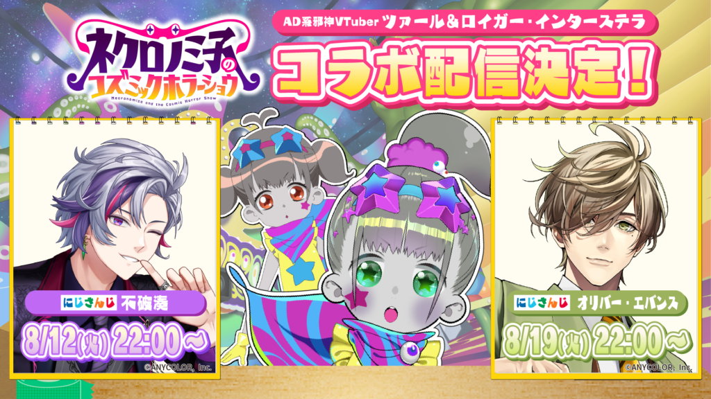 TVアニメ『ネクロノミ子のコズミックホラーショウ』の作中では、邪神として登場している本作の公式VTuberのツァール&ロイガー・インターステラさんと、第6話で声優としてゲスト出演された「にじさんじ」所属のバーチャルライバー・不破湊さん&オリバー・エバンスさんのコラボ配信が決定しました!