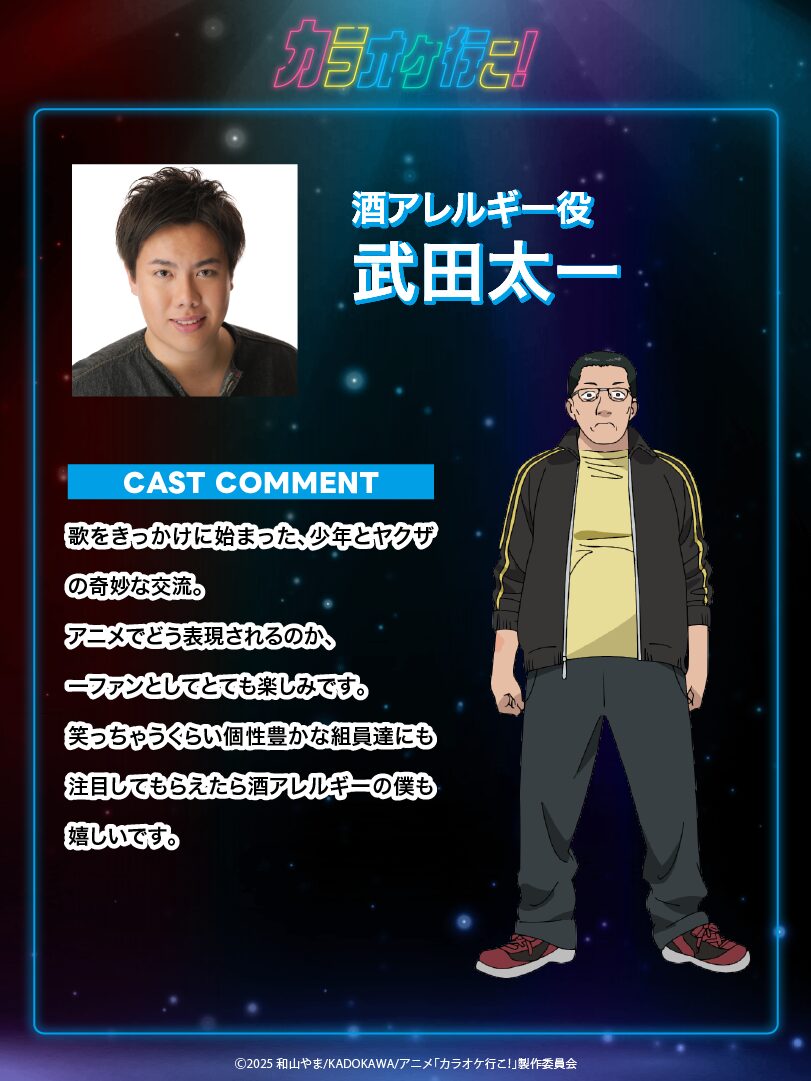 『カラオケ行こ!』に登場する追加ヤクザキャスト情報が公開されました。酒アレルギー役を武田太一さん、元4番役を梶川翔平さん、泣きぼくろ役を宮園拓夢さん、グラサン役をソンドさんがそれぞれ担当されます。4名からはコメントも届いたので、キャラクタービジュアルとあわせてご紹介!