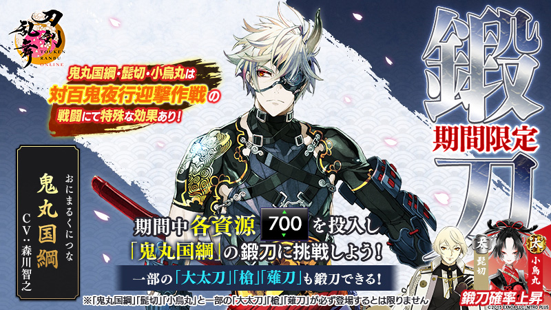 イベント「対百鬼夜行迎撃作戦」で、特殊な効果を持つ刀剣男士・鬼丸国綱(cv.森川智之)が期間限定で各資源「700」の鍛刀に登場。